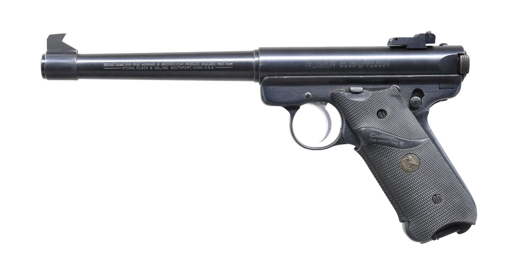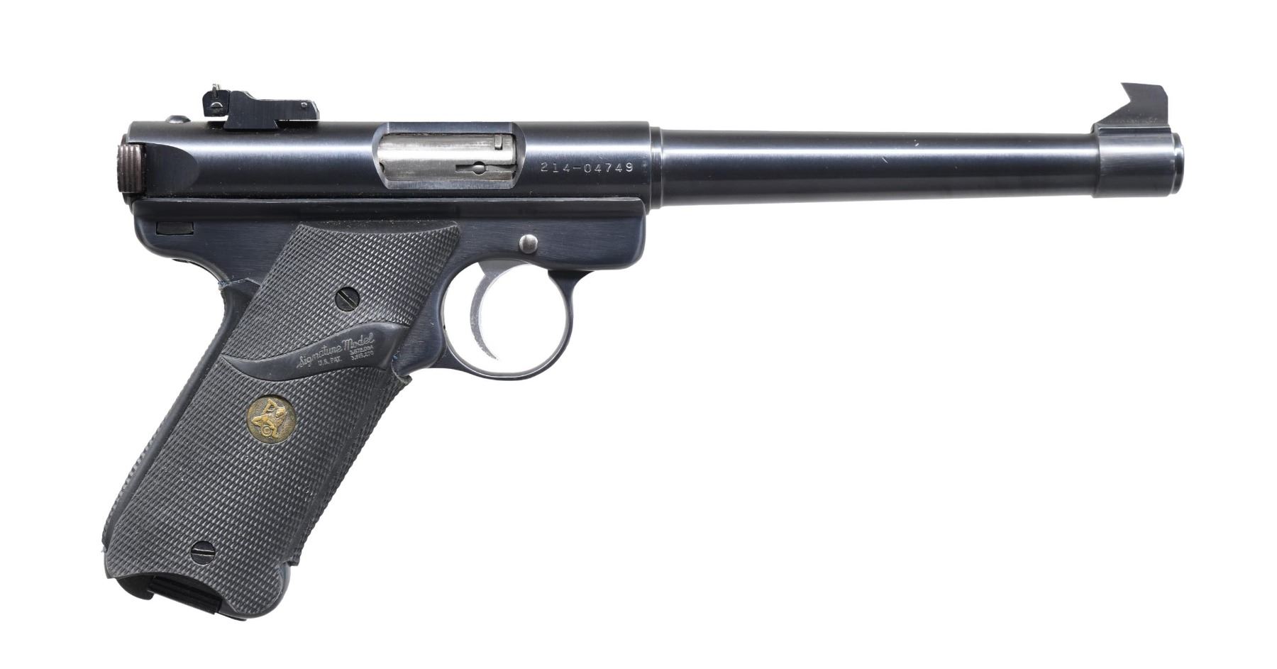 Cal. 22 LR. S# 214-04749. Bbl. 6 7/8" tapered target with squared slant cut front blade; factory receiver mounted adjustable rear. Mfg. 1988 (1982-2005 for all Mark II's) with blued finish, silver trigger, last round hold open and Pachmayr Signature rubber grips to include backstrap section. MAGS: 1 factory 10 rd. CONDITION: all aspects near excellent including bore and grips. (24-5469/NW). MODERN. $200-300.