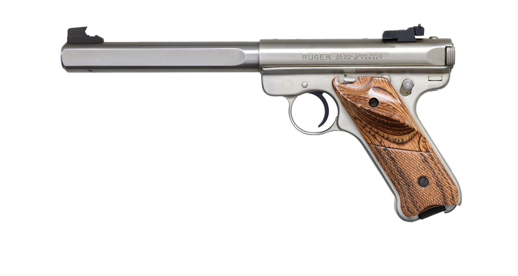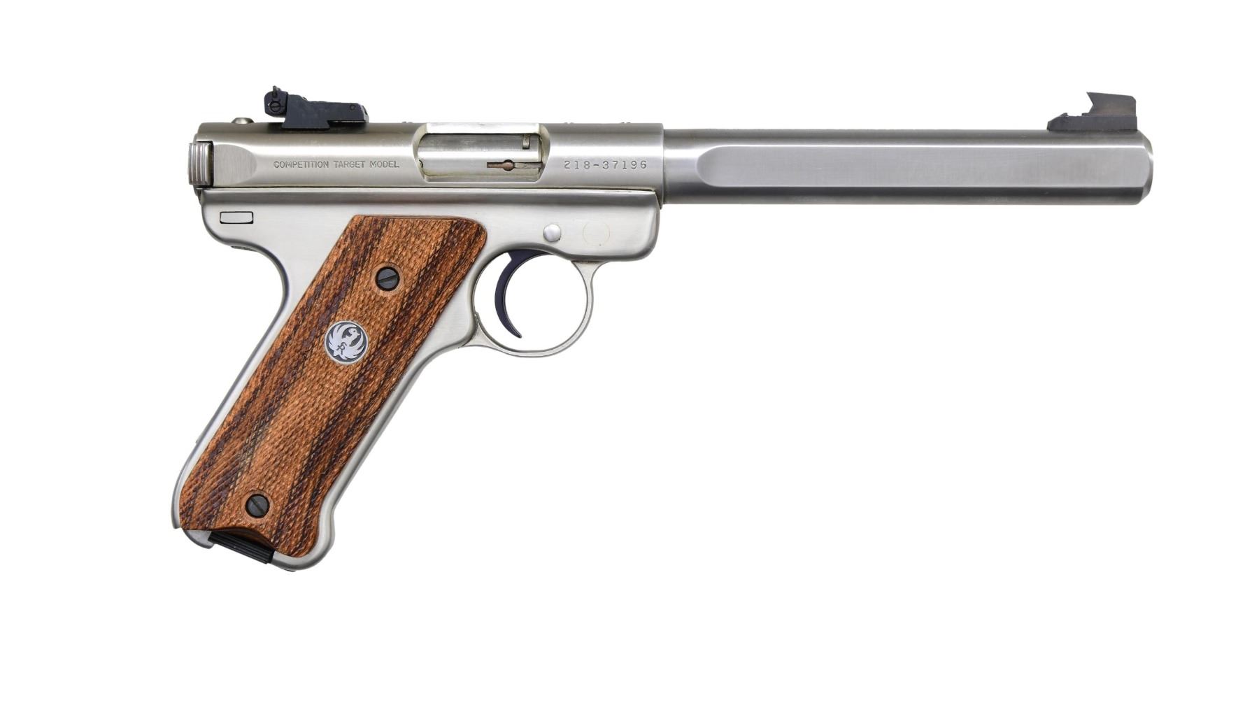 0186 SEMI AUTO PISTOL CAL. 22 LR S# 218-37196 (mfg. 1994). Stainless finish with 6.875" slab-side bull barrel. Fixed blade front sight and adjustable rear sight; 3-hole drilled and tapped. Checkered laminate wood grips with Ruger medallions. MAGS: one 10 Rd. CONDITION: overall near excellent condition, with 97% original finish on slide and frame. Bore is bright with sharp rifling. (24-4441/MD). MODERN. $300-$400.