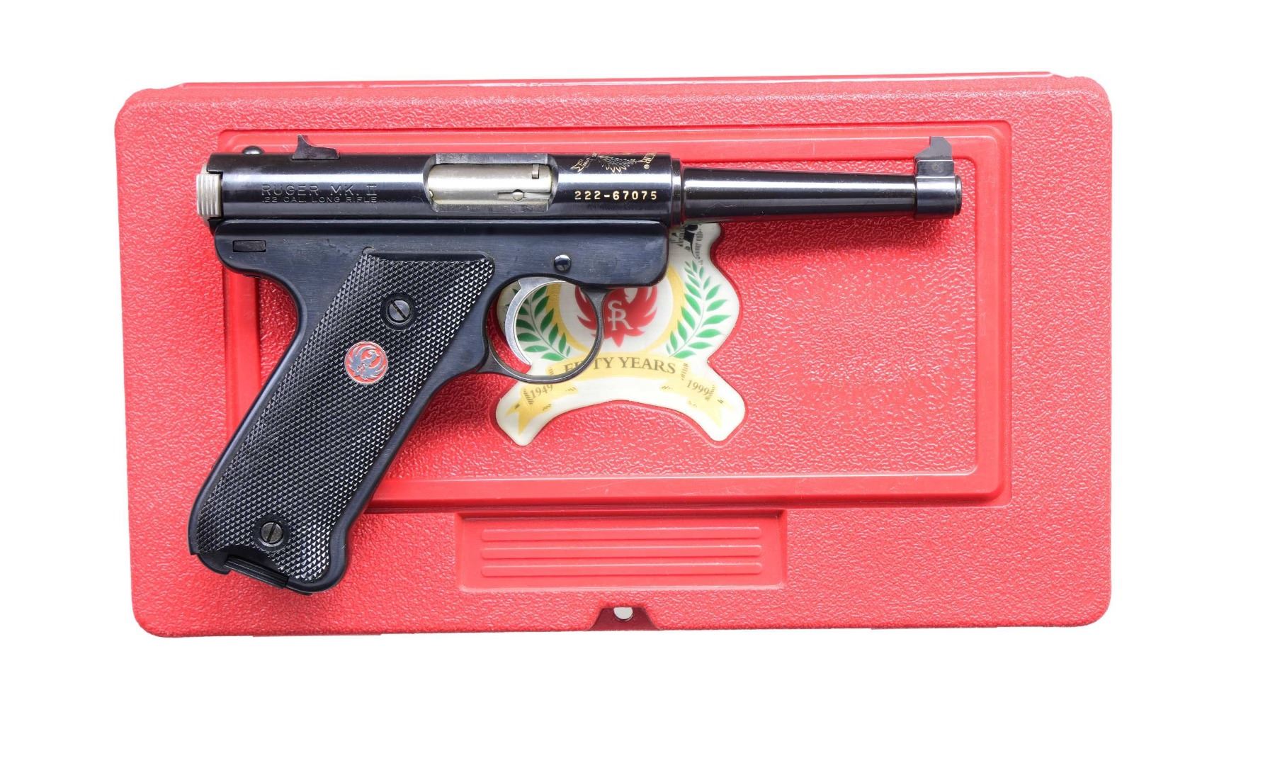 PISTOL WITH MATCHING FACTORY MODEL 0149 CASE. CAL. 22 LR S# 222-67075 (mfg. 1999). Top of receiver has gold filled Ruger 50th anniversary crest. Blued finish with 4.75 inch barrel. Fixed blade front sight and notch rear sight. Checkered black polymer grips with red Ruger medallions. MAGS: 2-10 Rds. UNATTACHED ACCESSORIES: Red 50th Anniversary factory case and manual. CONDITION: Overall near excellent condition with 98% original finish on slide and frame. Bore is bright with sharp rifling. MODERN (24-4459/MD) $350-$500.
