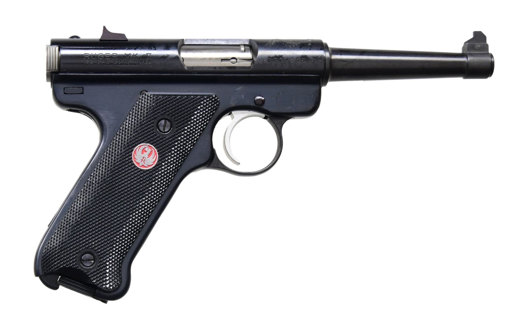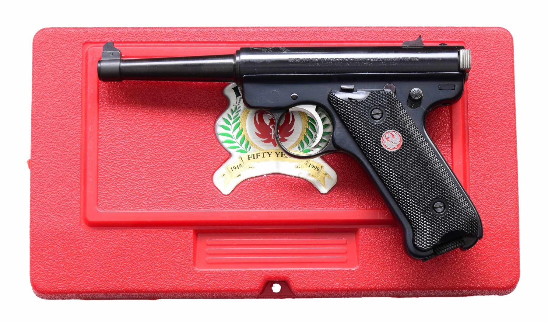 Cal. 22 LR. S# 223-00613. 50th Anniversary Edition Mark II model with blued finish produced in 1999. 6" barrel with fixed front sight and adjustable rear sight. Frame features left side thumb safety and left side magazine release. Black checkered plastic grips with Ruger medallions. MAGS: 2-10 Rds. UNATTACHED ACCESSORIES: Red Ruger case with 50th Anniversary emblem. CONDITION: Overall near excellent retaining over 95% original. Near excellent grips. Bore is bright with sharp rifling. MODERN (23-6604/MD) $200-$400.