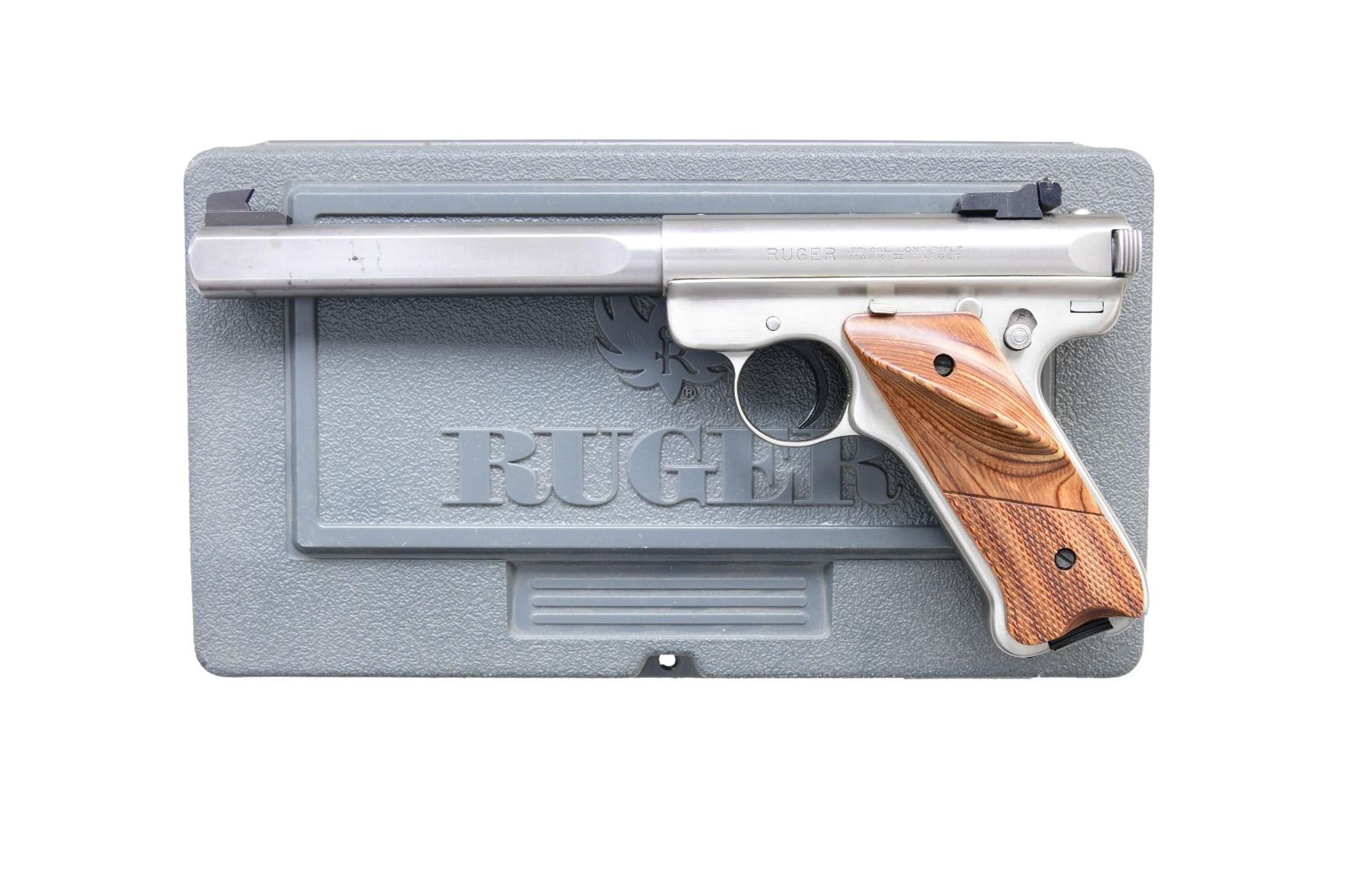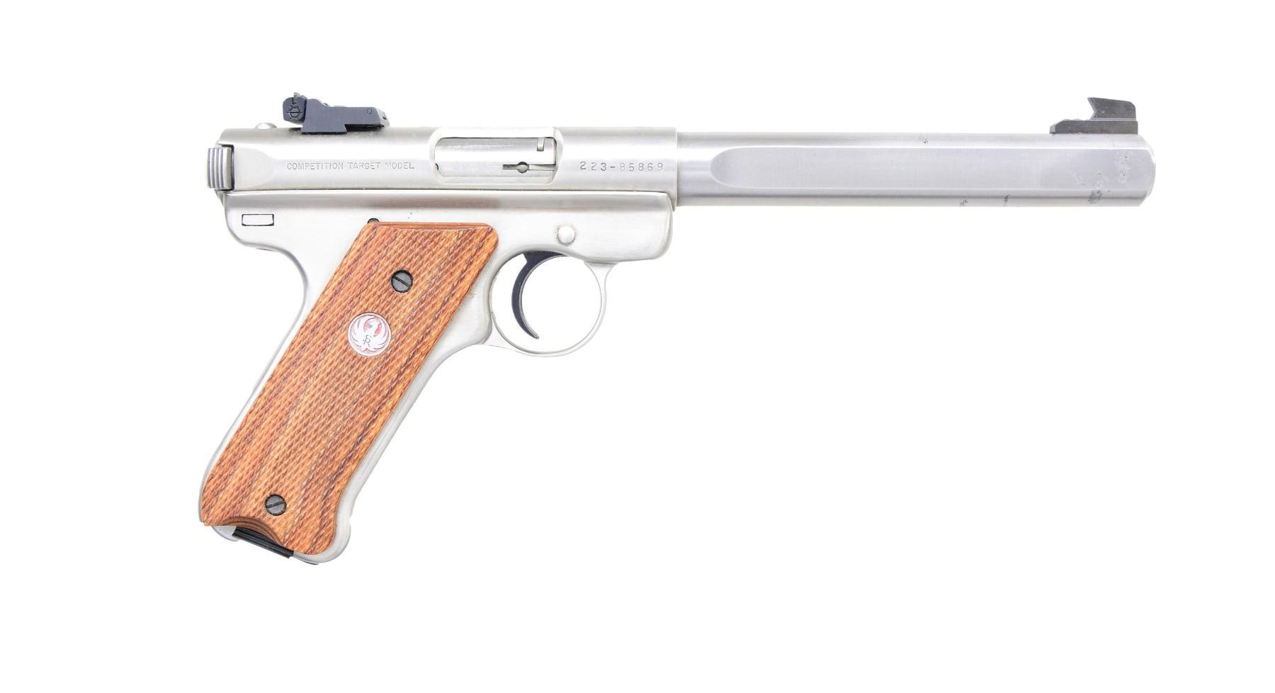 0186 SEMI AUTO PISTOL. Cal. 22 LR. S# 223-85869 (mfg. 2000). This Ruger Mark II Competition Target Model features a stainless steel finish with a 6.875-inch slab-sided barrel. The front sight is a fixed blade, and the rear sight is an adjustable notch. The grips are checkered brown laminate with Ruger medallion. MAGS: 1-10 Rds. CONDITION: Overall condition is very good to near excellent with approximately 95% of the stainless finish remaining on the slide and frame showing stains on barrel. The bore is bright with sharp rifling. MODERN (24-4841/MD) $300-$450.