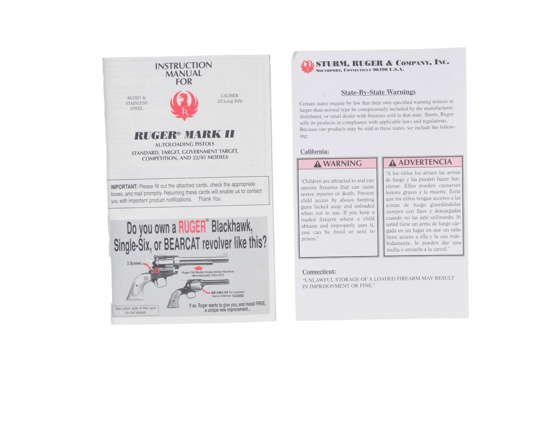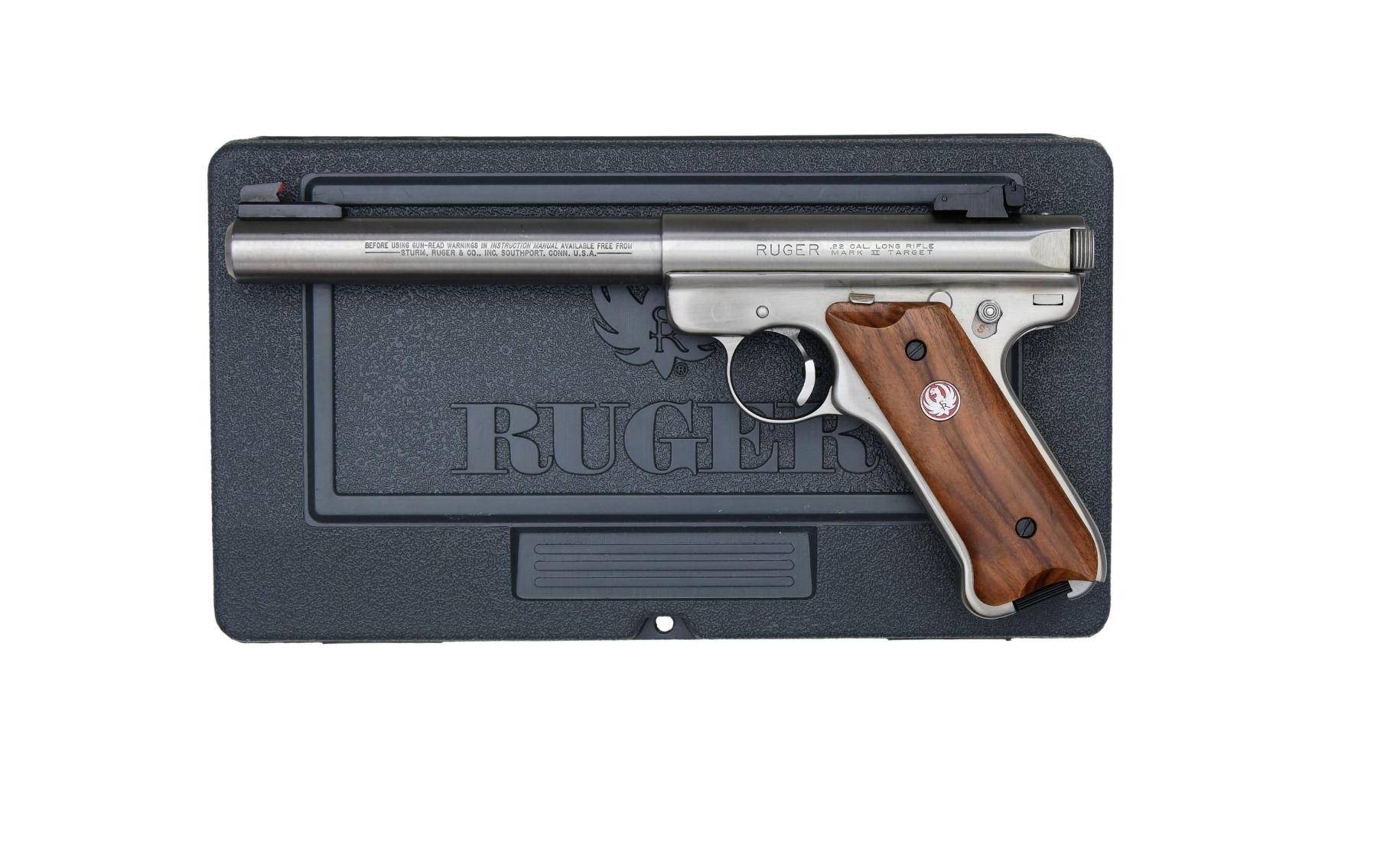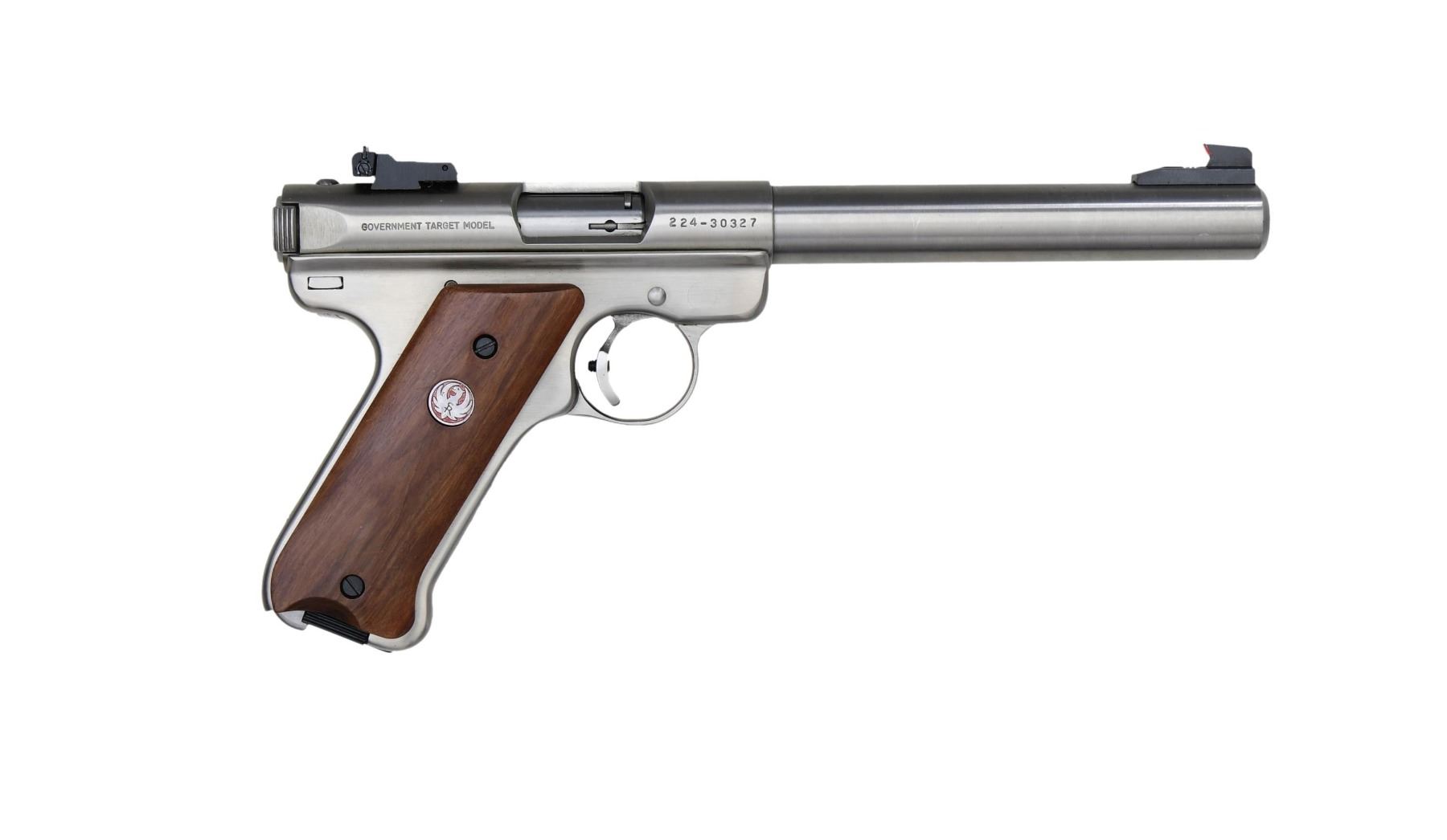 AUTO PISTOL WITH MATCHING NUMBERED BOX. Cal. 22 LR S# 224-30327 (2001). Model: 00185 / KMK678G. This Government Target Model features a stainless steel finish. It has a 6.88-inch heavy barrel with fixed front and adjustable rear sights. The frame configuration includes a left-side safety and a magazine release located on the bottom of the grip. The grips are checkered wood with Ruger medallions. MAGS: 1-10 Rds. UNATTACHED ACCESSORIES: Factory box and manual. CONDITION: Overall near excellent with approximately 97% finish coverage on the slide and frame. The bore is bright with strong rifling. PROVENANCE: Lifelong Collection of Terrence McCarty. MODERN (24-70/MD) $300-$400.