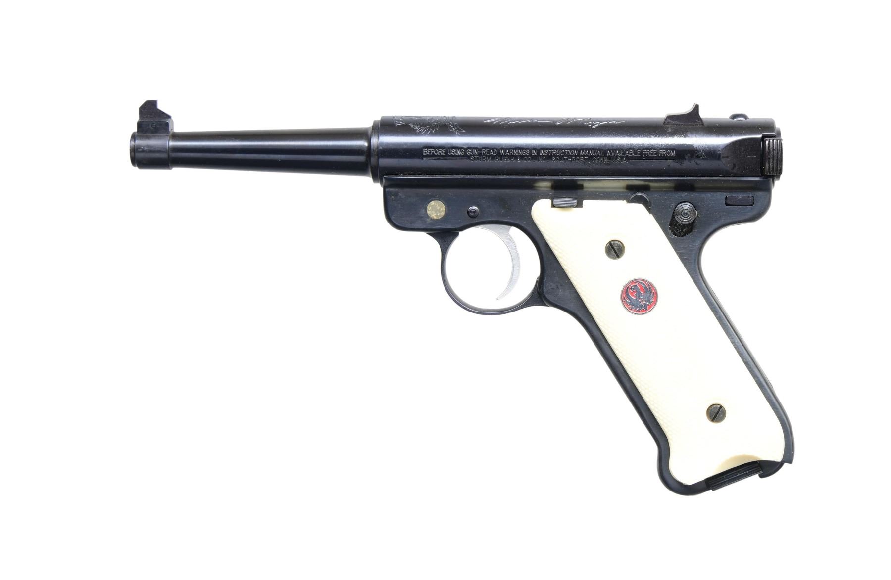 MARK II SEMI AUTO PISTOL WITH MATCHING FACTORY MODEL 0169 BOX. CAL. 22 LR S# NRA-09542 (2003). Top of receiver has William B Ruger signature along with Ruger & NRA endowment crest; bolt face has Ruger emblem. Blued finish with 4.75 inch barrel. Fixed blade front sight and notch rear sight. Checkered white polymer grips with red Ruger medallions. MAGS: 2-10 Rds. UNATTACHED ACCESSORIES: Factory case, manual, and NRA certificate. CONDITION: Overall excellent condition with 98% original finish on slide and frame. Bore is bright with sharp rifling. MODERN (24-4458/MD) $350-$500.