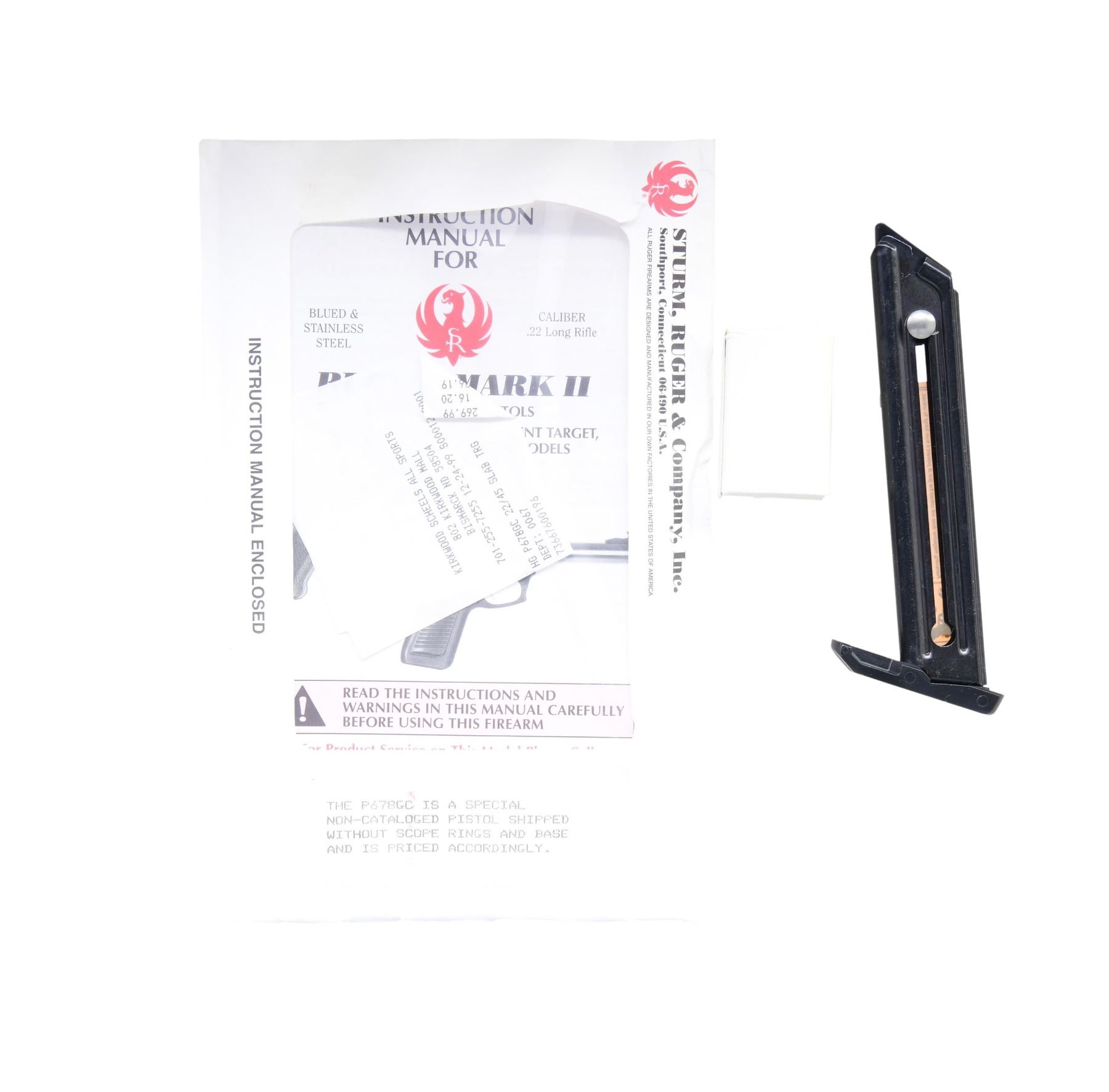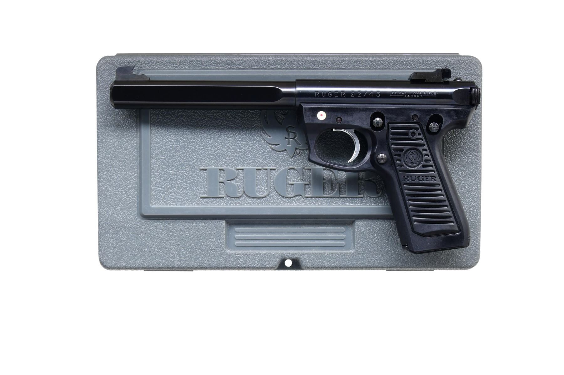 SEMI AUTO PISTOL WITH MATCHING FACTORY BOX. Cal. 22 LR. S# 222-79806 (1999). Catalog No. P678GC. This Ruger 22/45 Competition Target Model features a blued finish. It has a 5.5" bull slab-side barrel, adjustable rear sight, and fixed front sight. The grips are checkered black polymer. MAGS: two 10 Rds. UNATTACHED ACCESSORIES: factory box, manual, and paperwork. CONDITION: overall very good condition, with approximately 85% of the original blued finish remaining on the slide. The frame retains about 85% of the finish. Bore is bright with strong rifling. (24-2925/MD). MODERN. $250-$350.
