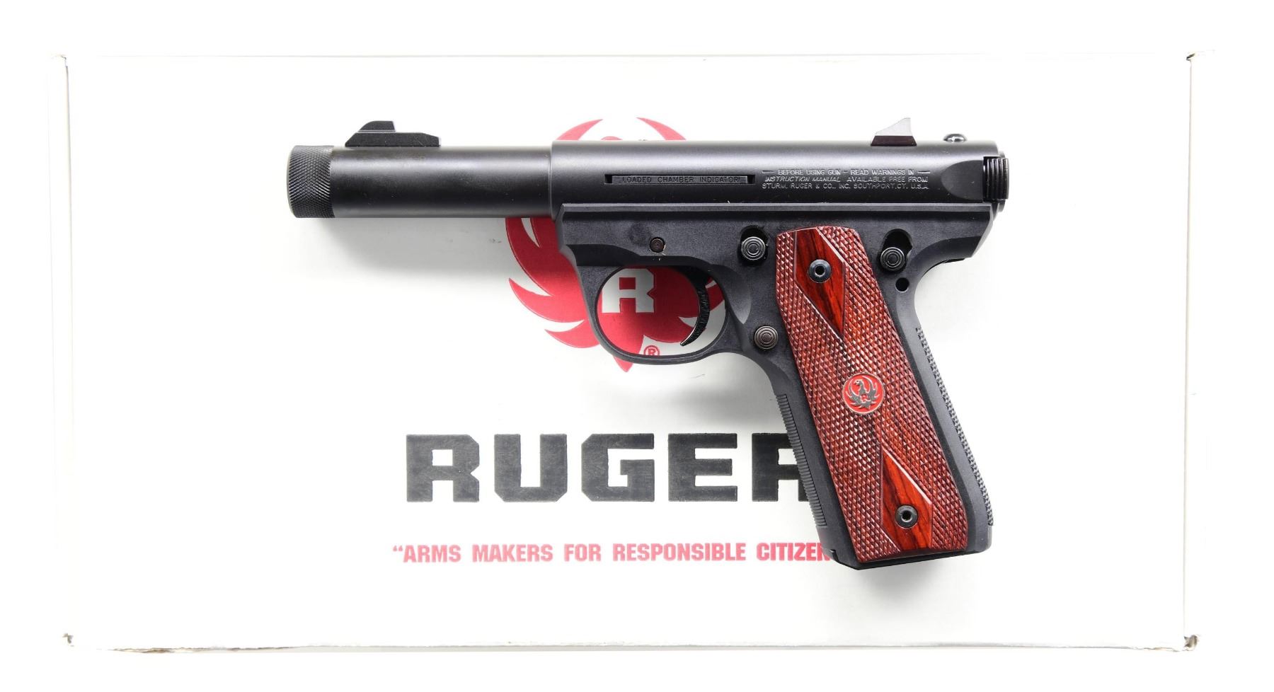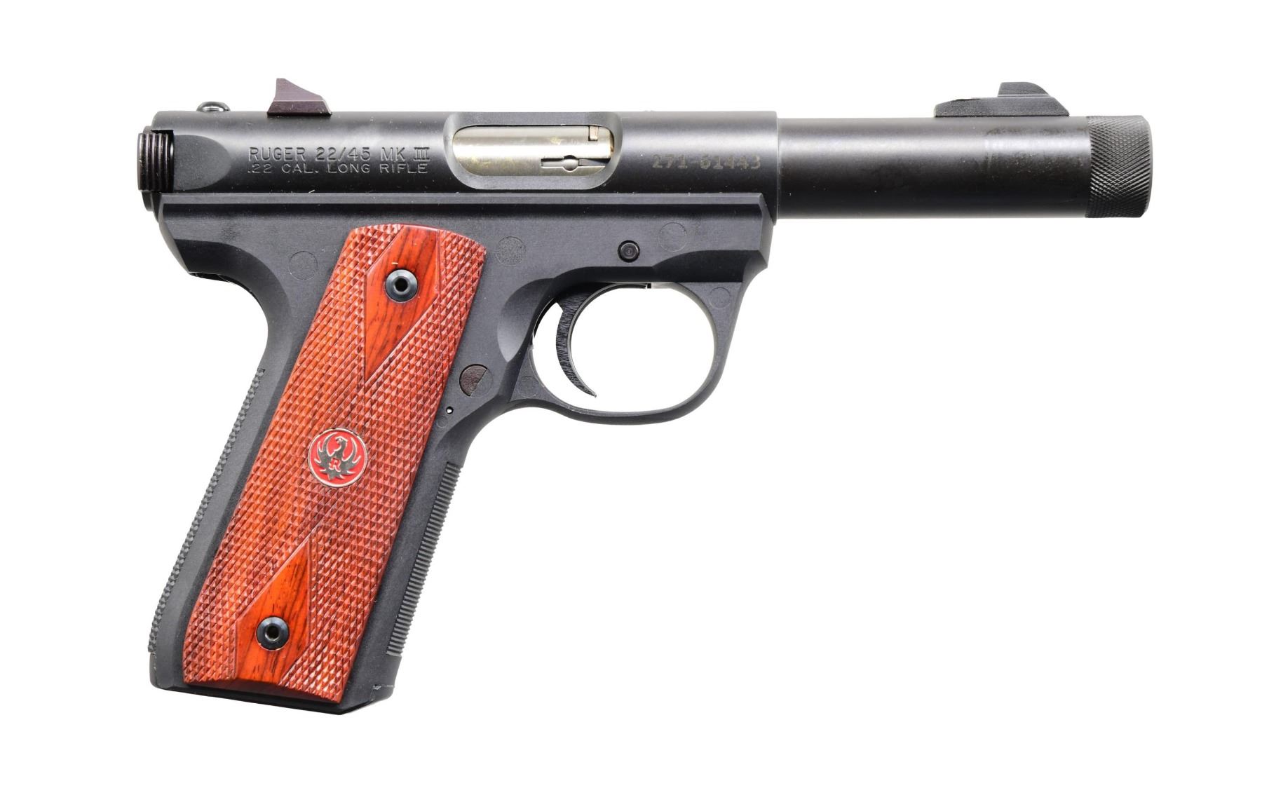 WITH MATCHING FACTORY BOX. Cal. 22 LR. S# 271-61443. Bbl. 4 3/8". Model 22/45 MK III semi-automatic pistol mfg. by Ruger in 2011. Left side of the receiver is marked with Ruger's mfg. information, with the model designation, cal. designation, as well as the S# marked on the right. Receiver and bbl. exhibit a matte black finish, with the bolt being polished in-the-white. Black polymer frame with 2-piece Ruger medallion checkered wood grips. Blade front sight with square notch rear sight. Top of the receiver is drilled and tapped. Threaded bbl. MAGS: one 10-rd. UNATTACHED ACCESSORIES: matching factory box containing a soft case and factory paperwork. CONDITION: near new, with metal components retaining virtually all of their original factory finish overall. Frame and grips are excellent overall. Box shows some light exterior wear, with a tear present on the left side of the lid. (24-2950/MLW). MODERN. $250-350.
