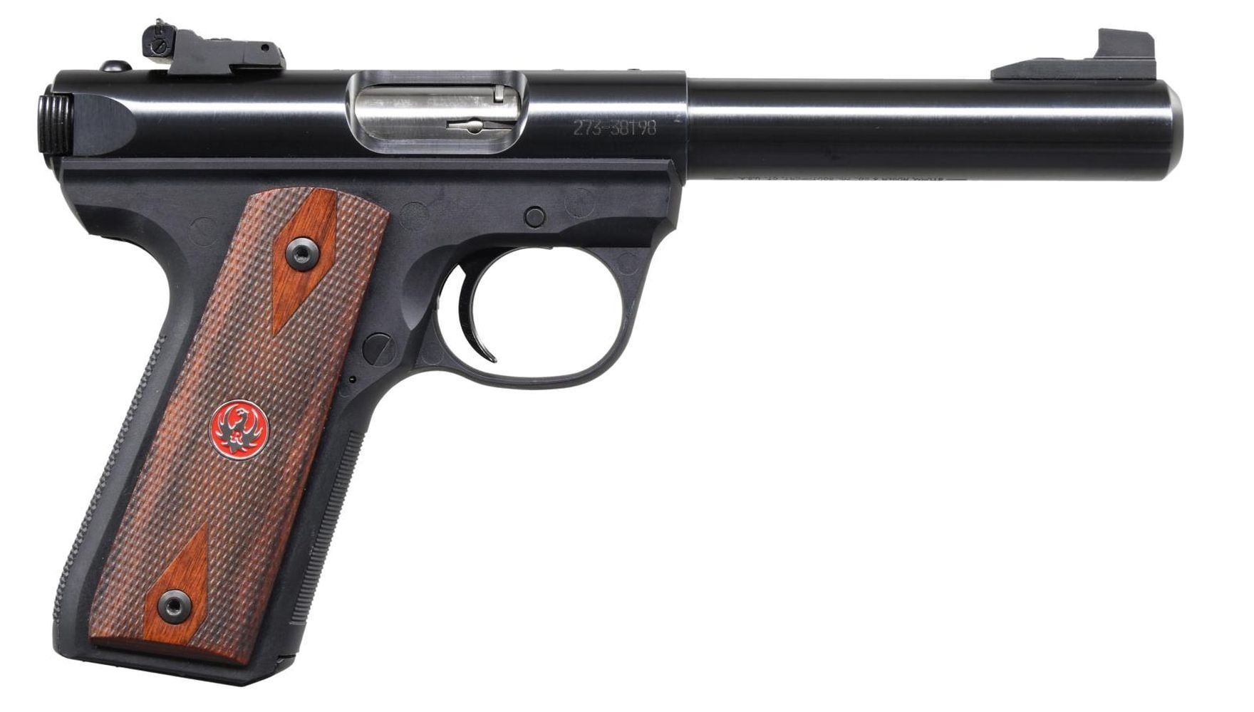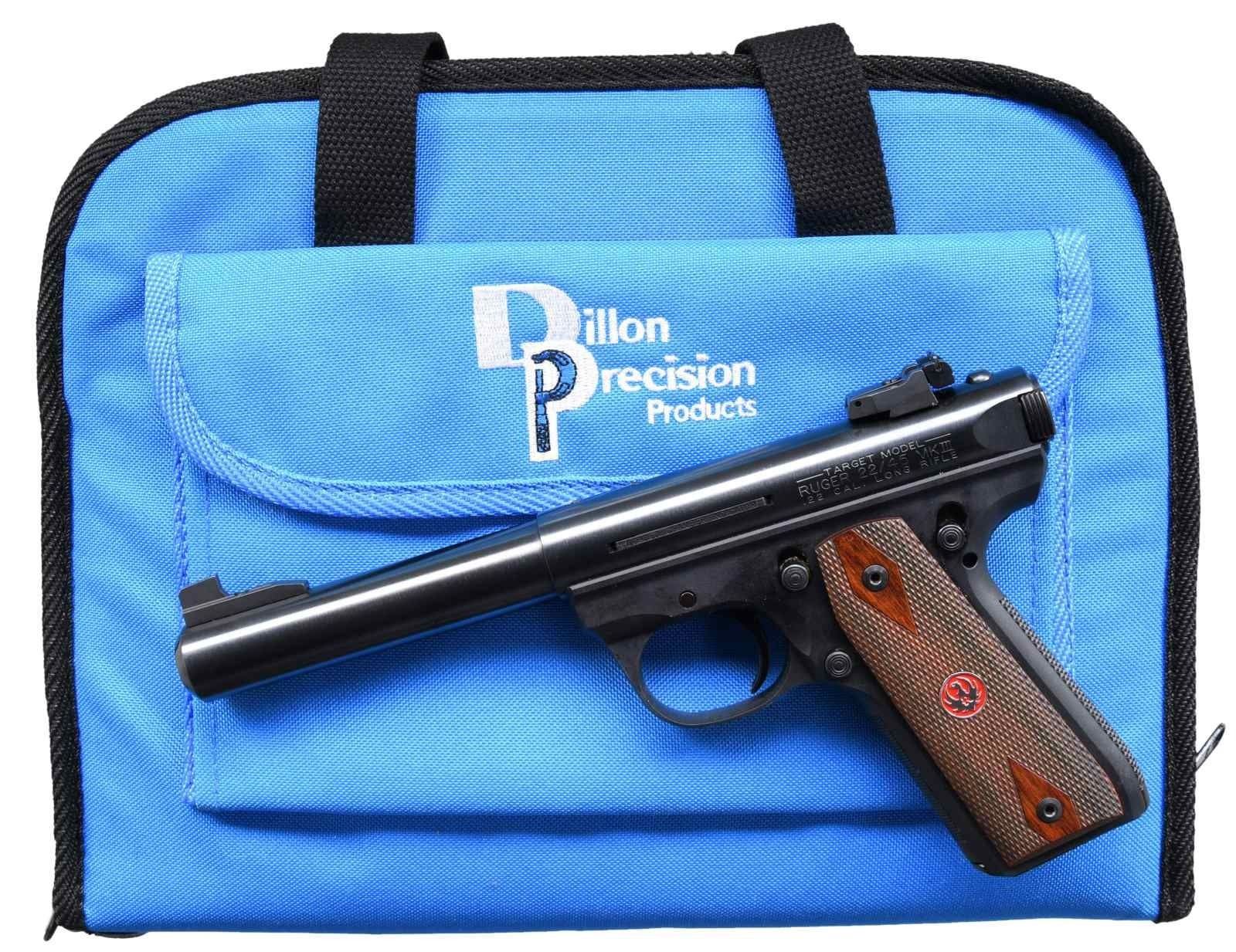 SEMI-AUTO PISTOL. Cal. 22 LR. S# 273-38198. Bbl. 5 1/2", hammer-forged bull with screw-attached ramped Patridge-faced sight; receiver-mounted adjustable rear. Mfg. 2013 (2005–2016) as blued Model 10140. Numerous features include: polymer frame, push button magazine release, internal key lock safety (no key; available from Ruger), extended round slide lock, checkered double diamond military-style hardwood grips with red background eagle medallions, black serrated trigger, magazine safety, recessed crown, receiver drilled and tapped for scope base, and Allen head grip screws. MAGS: 1 factory, 10 rd. UNATTACHED ACCESSORIES: Triple K thumb break cordovan-colored leather holster marked for a 6 7/8" barrel, plus bright blue Dillon Precision Products nylon range bag with mag and accessory pouches; both near excellent. CONDITION: all aspects are near excellent, including bore and grips; still have a red inspection sticker on the frame. (24-904/NW). MODERN. $250-400.