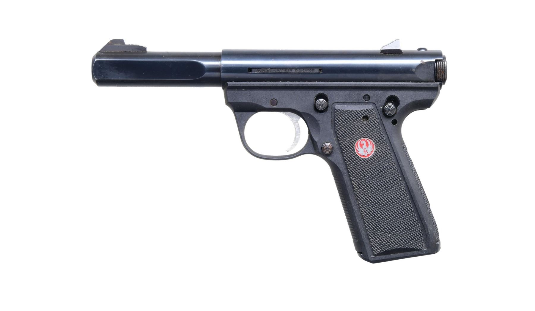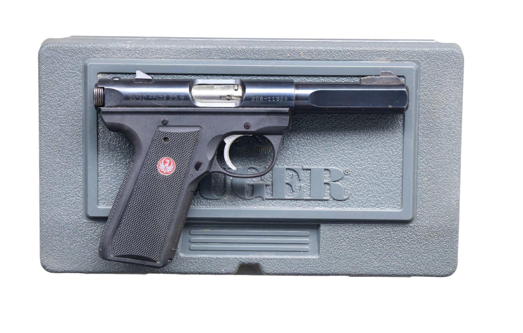 WITH MATCHING FACTORY MODEL 10119 CASE. Cal. 22 LR. S# 228-11328 (2005). Blued finish with 4.5" slab side bull barrel. Three-dot fixed sights. Checkered black polymer grip with Ruger medallions. MAGS: one 10rnd. UNATTACHED ACCESSORIES: factory case, manual, and lock keys. CONDITION: overall excellent condition, with 95% of original finish on the slide and frame with occasional spots of oxidation. Bore is bright with sharp rifling. (24-4453/MD). MODERN. $250-$350.
