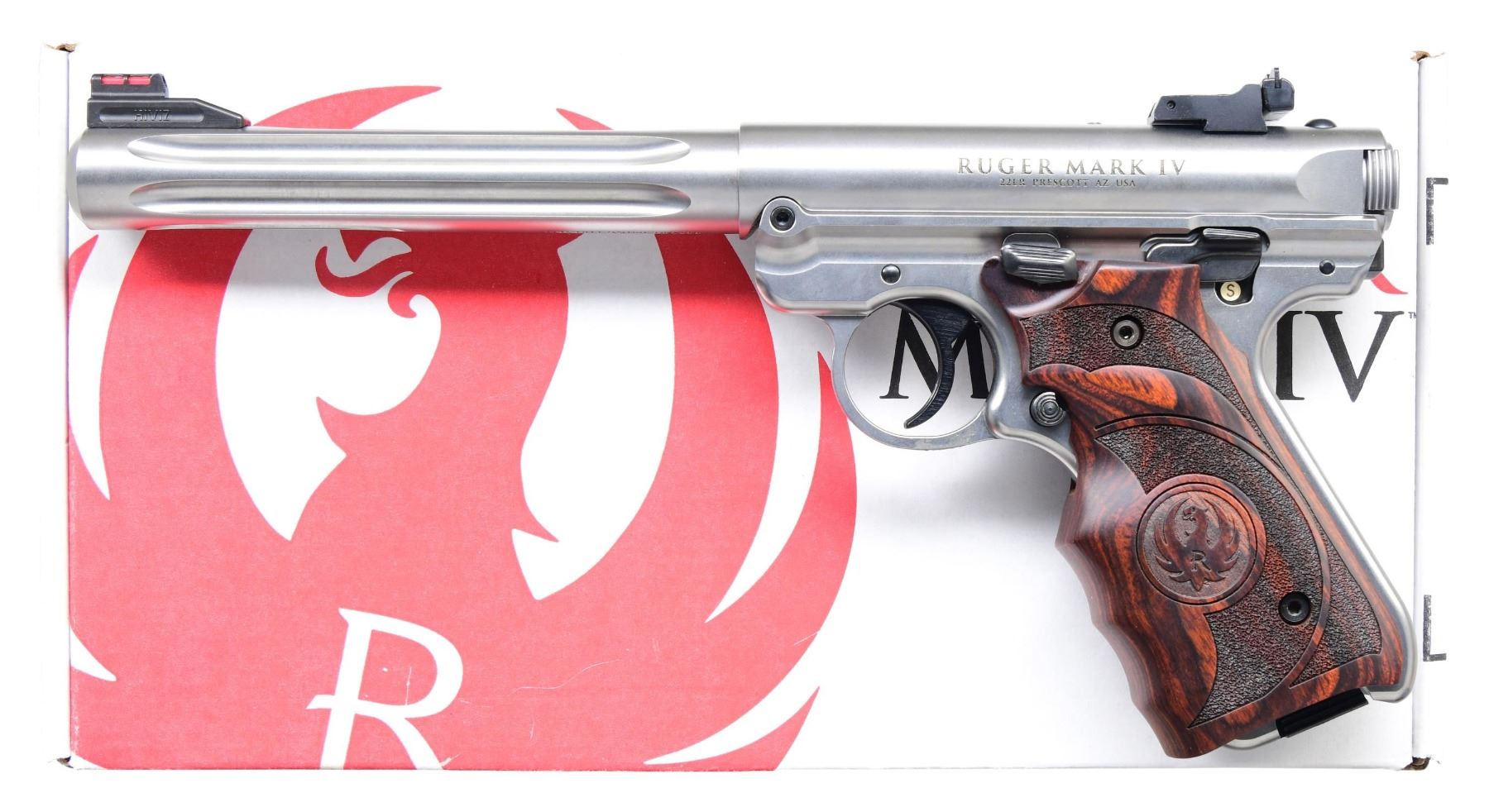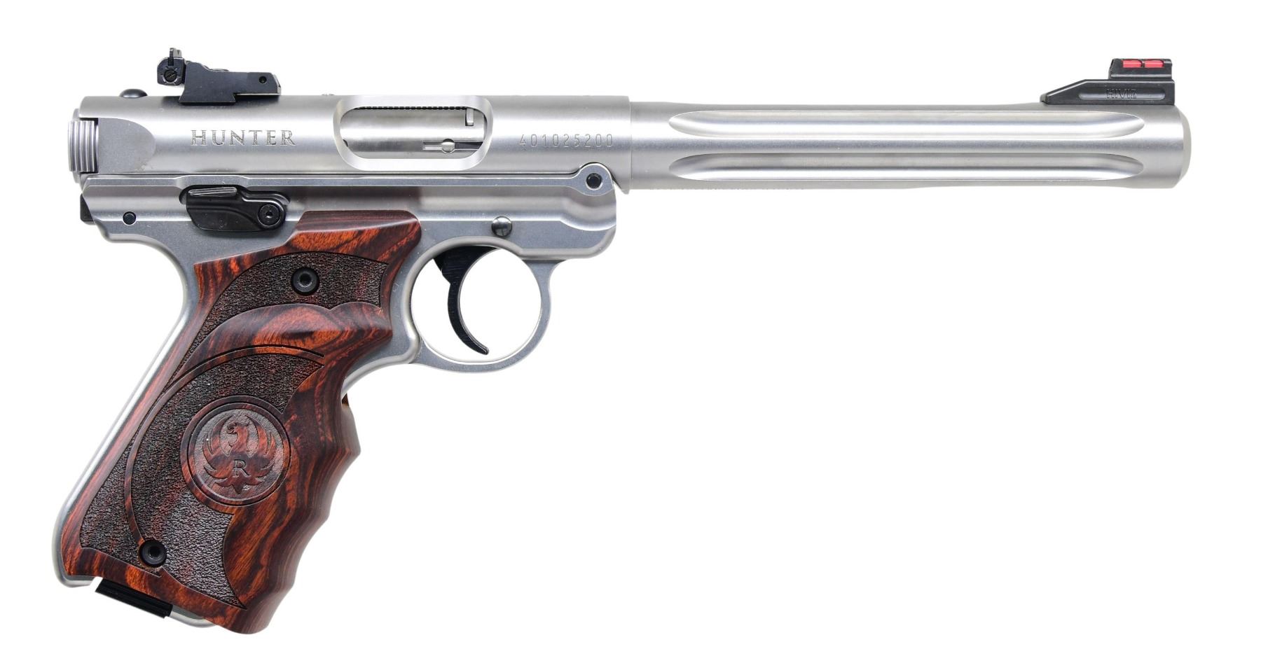 WITH FACTORY BOX Cal. 22 LR S# 401025200 stainless steel finish. Produced from 2016 to present with an estimated production of over 100,000 units. Features a 6.75-inch fluted barrel, fiber optic front sight, and adjustable rear sight. Trigger is a target model with a contoured laminated wood grip featuring the Ruger logo. MAGS: 2-10 Rds. UNATTACHED ACCESSORIES: Factory box, instruction manuals, and promotional literature. CONDITION: Overall excellent condition. Bore is bright with sharp rifling. MODERN (23-6100) $350-550.