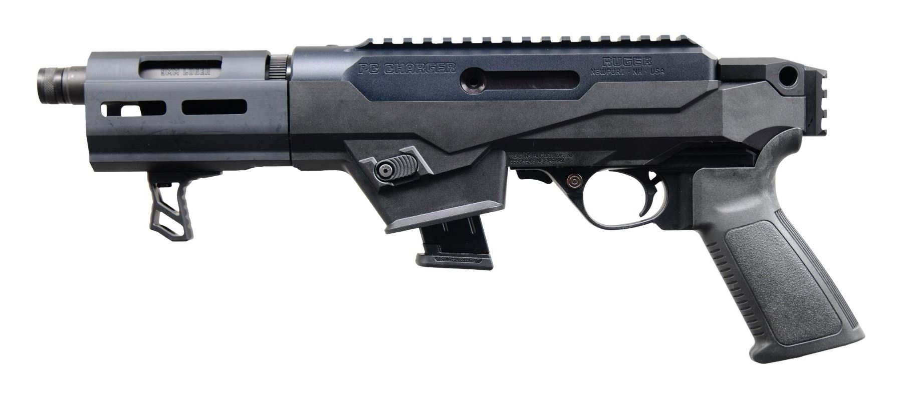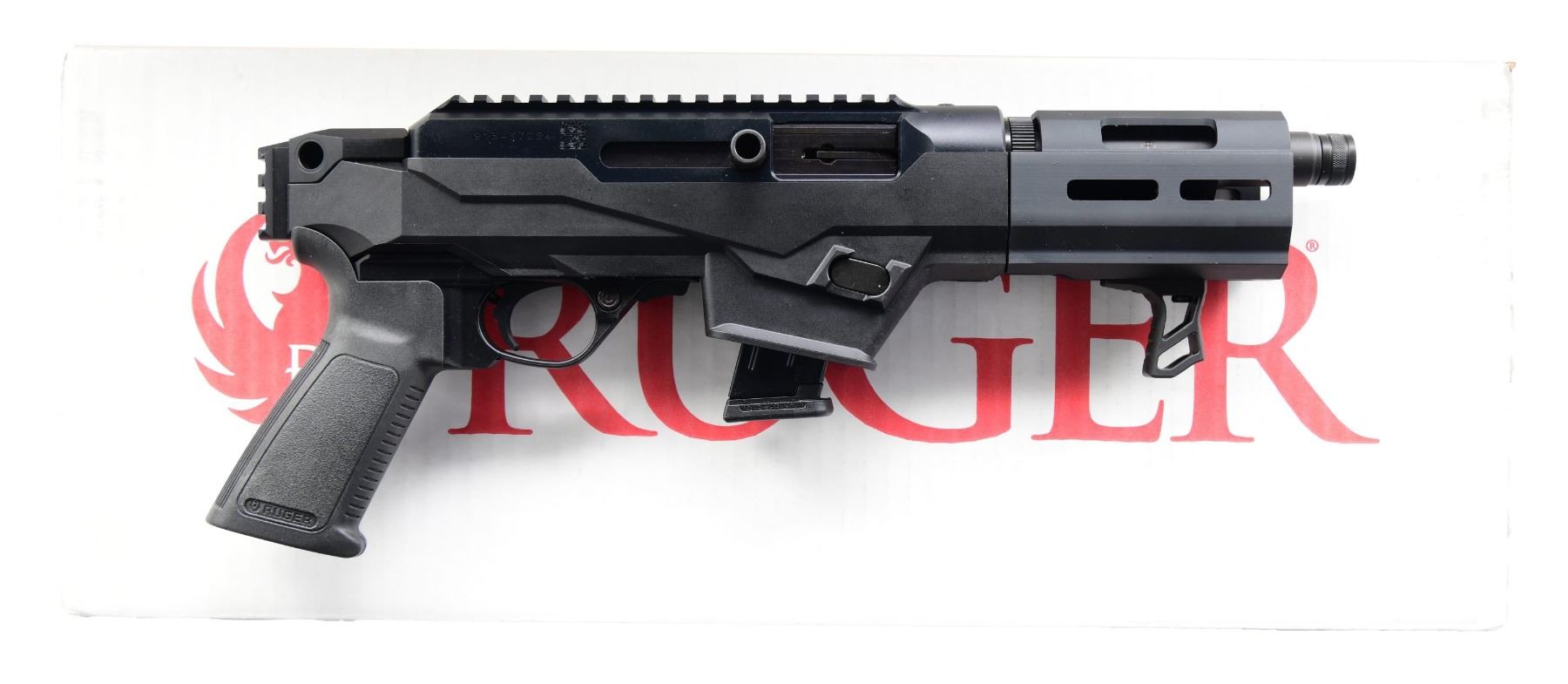 WITH MATCHING FACTORY BOX. Cal. 9mm Luger. S# 913-37254. Bbl. 6 1/2". PC Charger semi-automatic pistol mfg. by Ruger in 2021. Left side of the bbl. is marked with the cal. designation. Left side of receiver is marked "PC CHARGER", followed by Ruger's mfg. information, with the S# marked on the right. Aluminum receiver and handguard exhibit a black hard-coat anodized finish, with the bbl. exhibiting a matte blue finish. Black polymer chassis, with Ruger textured black polymer grip. Handguard with M-LOK slots and UTG handstop. MAGS: 1 10-rd. UNATTACHED ACCESSORIES: matching factory box. CONDITION: near new, with metal components retaining virtually all of their original factory finishes overall. Mirror bore, exhibiting well defined rifling throughout. Polymer chassis and grip are excellent. Box shows some light to mild exterior wear from handling and storage, but otherwise remains sturdy and serviceable. (24-6288/MLW). MODERN. $300-500.