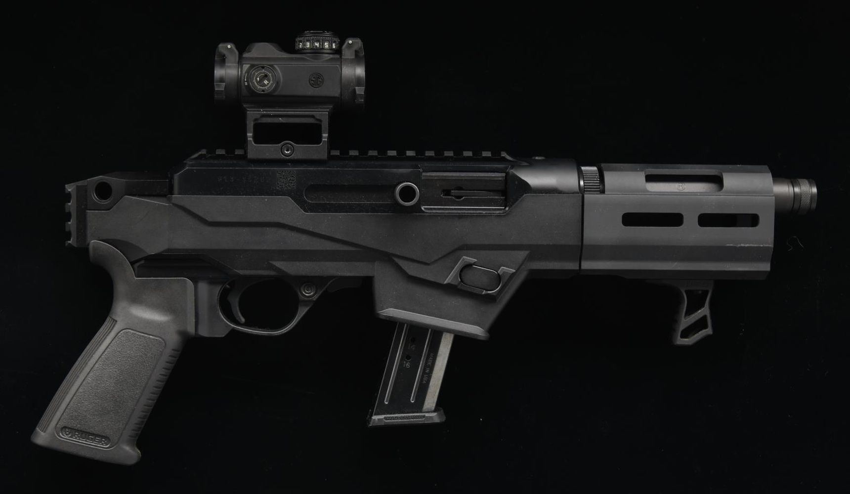 Cal. 9mm Luger. S# 913-35202. Bbl. 6.5" threaded 1/2"-28 with thread protector. Mfg. 2021 as PC (Pistol Caliber) takedown variant secured in polymer chassis having anodized alloy handguard with factory installed hand stop at 6 o'clock position plus M-Lok slots for accessory attachments. Model 29100 with MSRP of $899. Integral flared magazine well, integral Picatinny rail for sight installations, QD cups for detachable sling attachment at rear, accepts standard AR grips plus reversible magazine latch and charging handle. Sig Sauer ROMEO-MSR red dot sight on its Picatinny rail. MAGS: 1 factory 17 rd. SR, Security-9 type. UNATTACHED ACCESSORIES: matching numbered factory box and packaging to include Glock compatible magazine well. CONDITION: all aspects near excellent (including bore); appears new and unfired. PROVENANCE: The Collection of Gun Sport Ltd. owned by Jon R. Thomas. (23-4201/NW). MODERN. $500-750.