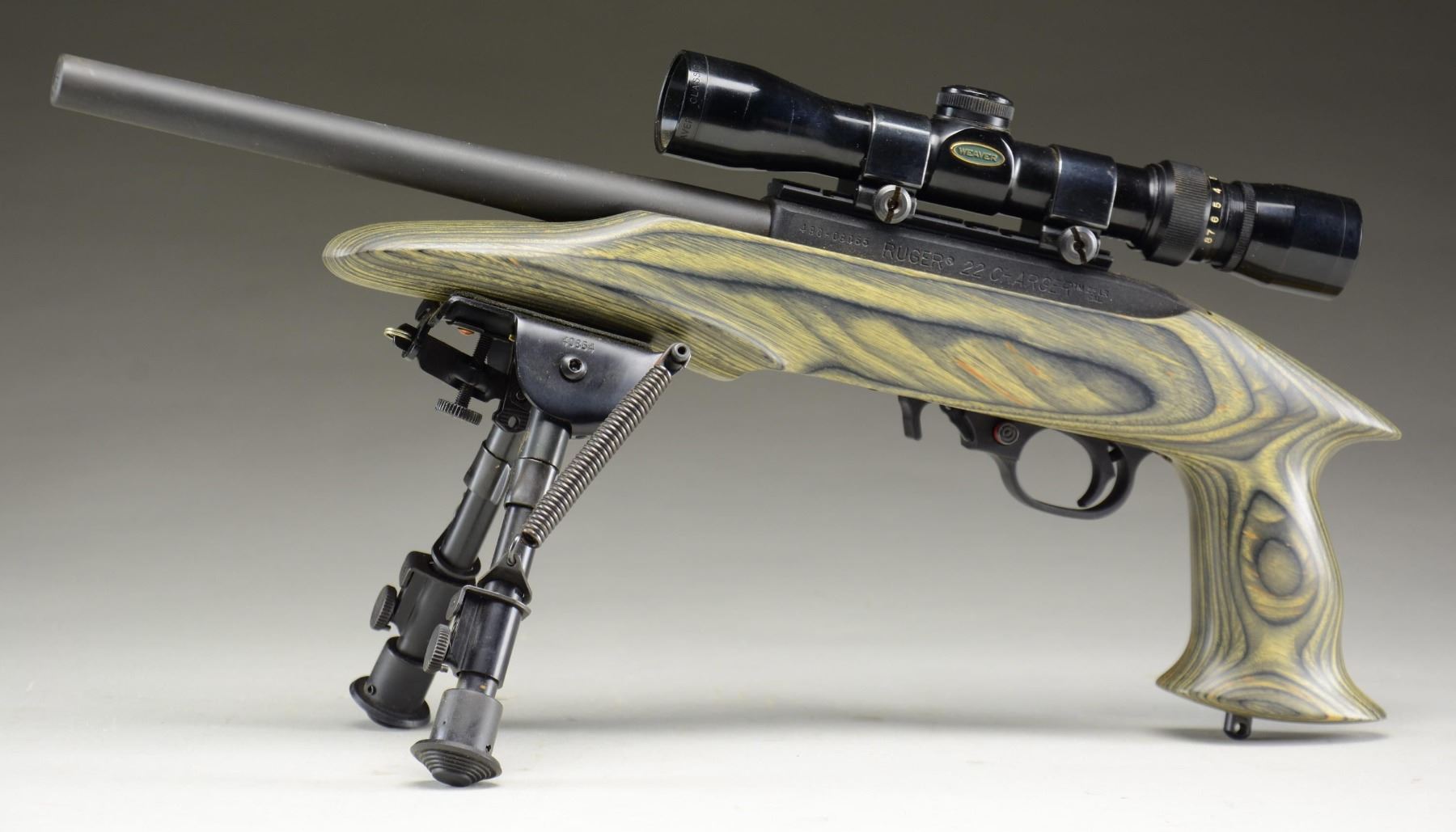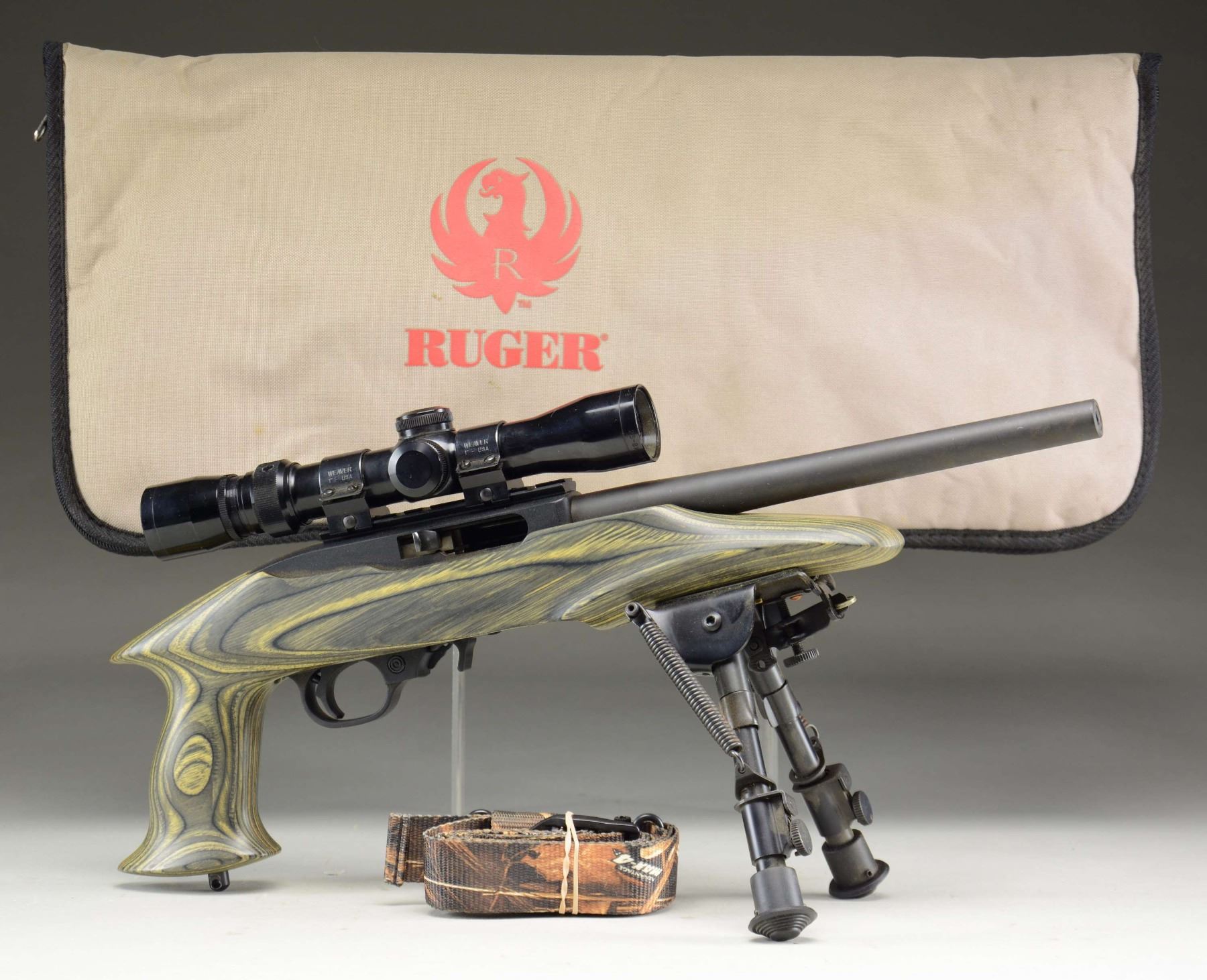 Cal. 22 LR. S# 490-09065. Bbl. 10" matte finished without provision for sights; recessed target crown. Mfg. 2008 as Model 04901 having laminated stock with Ruger (Harris style) bipod plus factory adapter base with Weaver scope rings and gloss finished Weaver Classic VH-8 duplex reticle 2.5-8X28 scope. Sling studs and extended mag. release. MAGS: 1 factory 10 rd. UNATTACHED ACCESSORIES: Cabela's camo nylon carry sling and Ruger nylon zippered carry case. CONDITION: all aspects near excellent including bore and scope set. (24-4437/NW). MODERN. $350-500.
