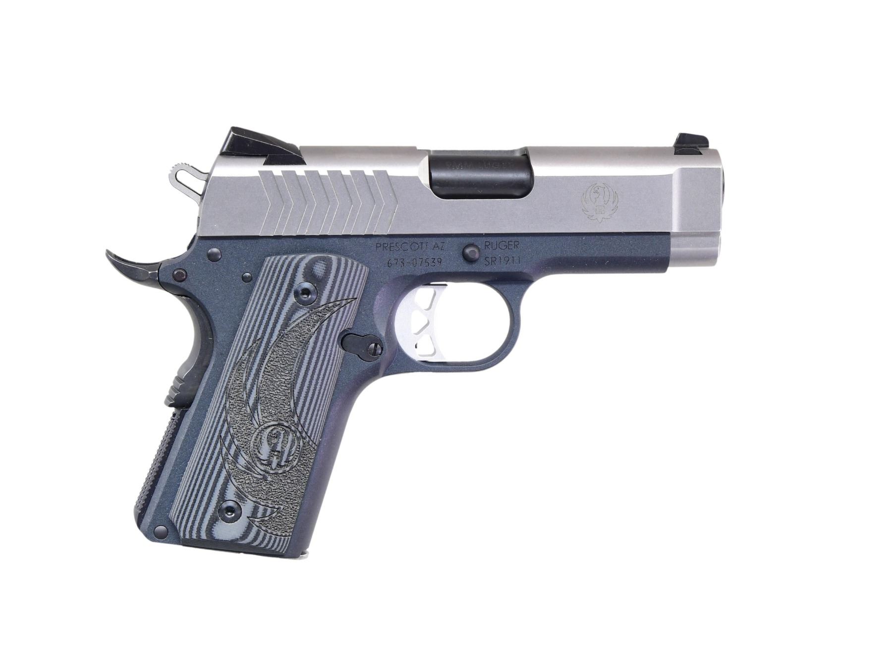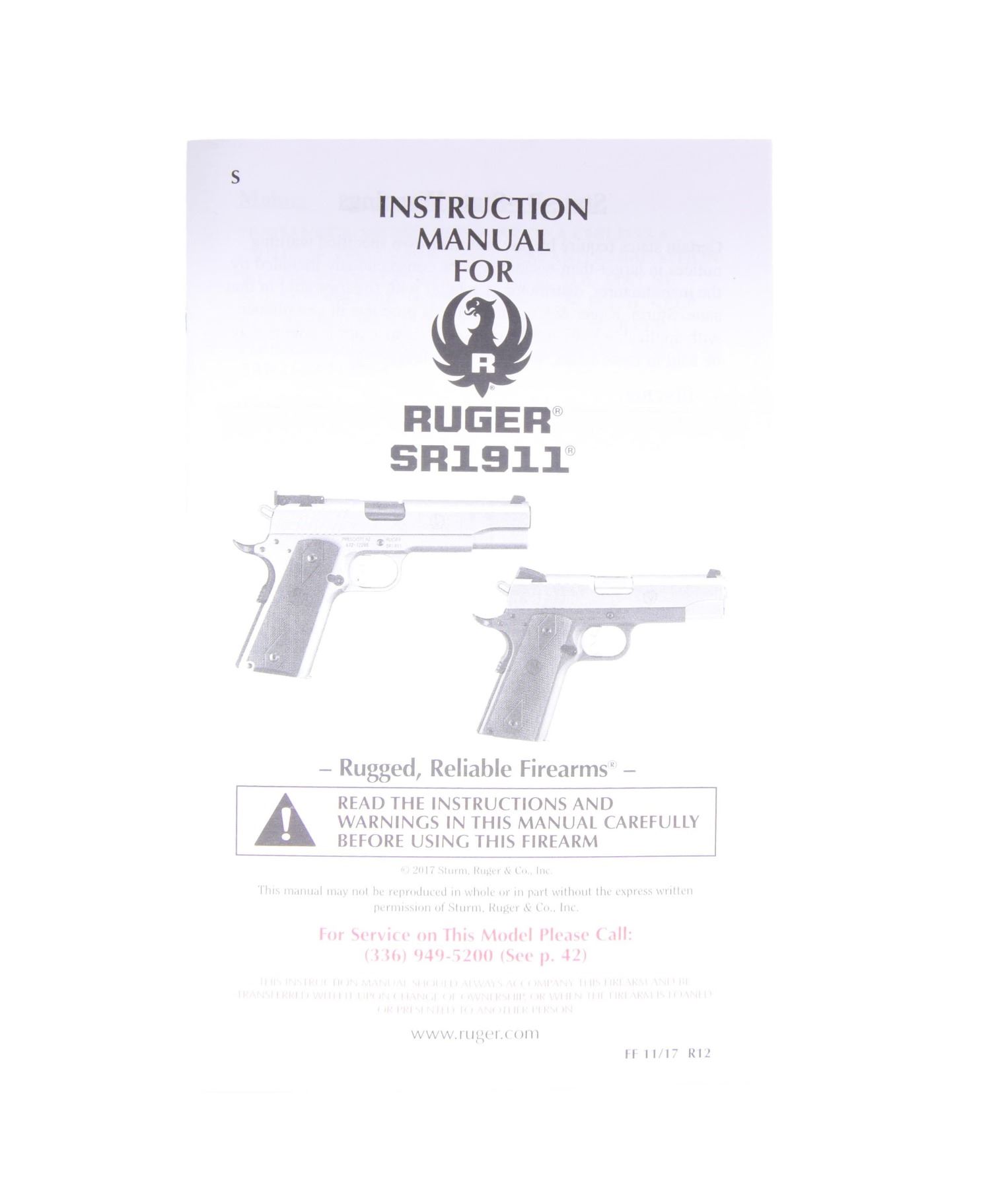 Cal. 9mm Luger S# 673-07539. The SR1911 model was introduced in 2011. The pistol features a stainless steel finish with a 3.6-inch barrel. The front sight is a fixed white dot, and the rear sight is an adjustable white dot. The trigger is a skeletonized aluminum, and the hammer is a skeletonized Commander-style. The frame configuration includes a thumb safety and a beavertail grip safety. Grips are black stippled G10 with the Ruger emblem. MAGS: 2-9 Rd. UNATTACHED ACCESSORIES: Factory box and manual. CONDITION: Overall excellent with approximately 98% of the original finish remaining. Frame finish retains about 98%. Bore is bright with sharp rifling. MODERN (23-6165) $350-500