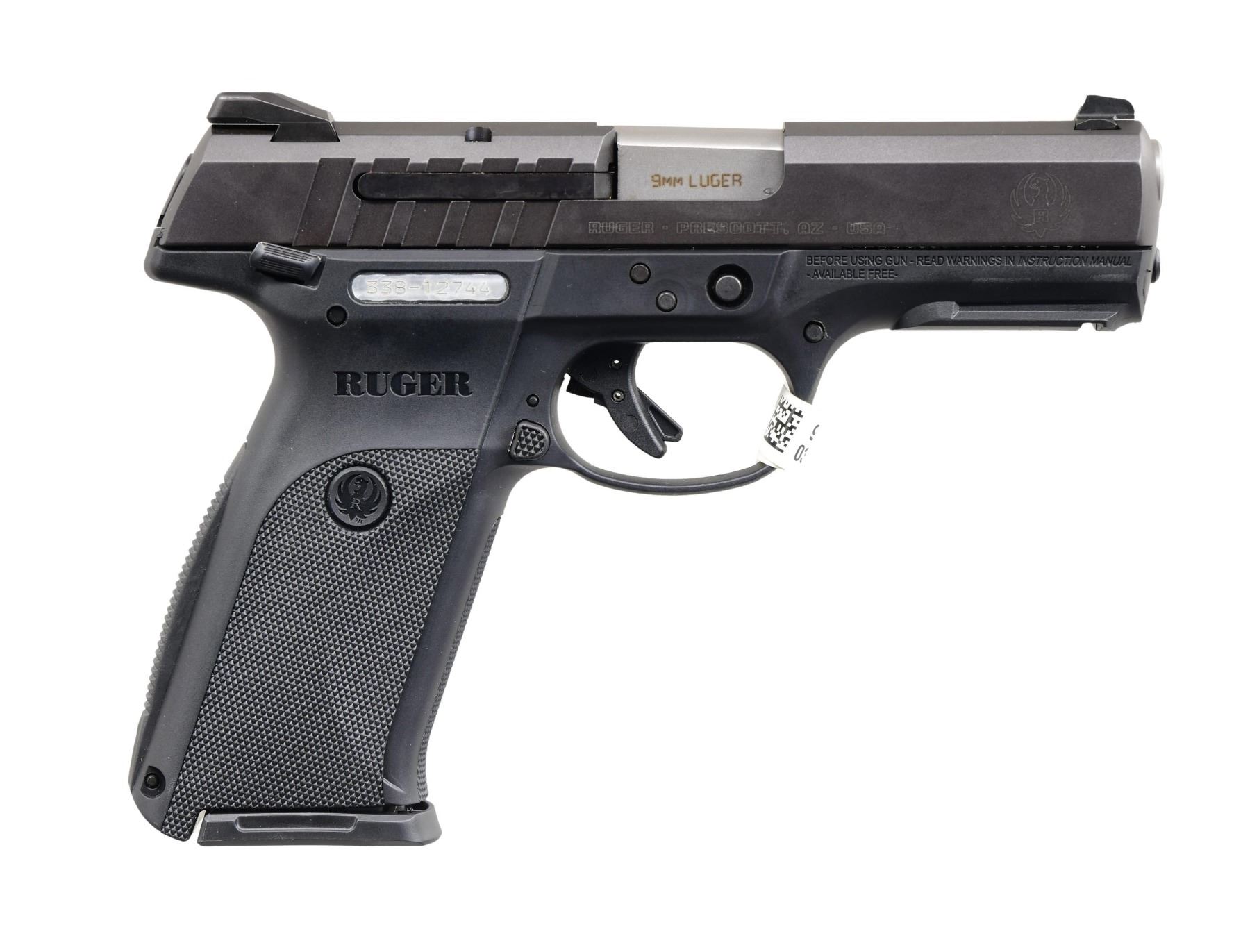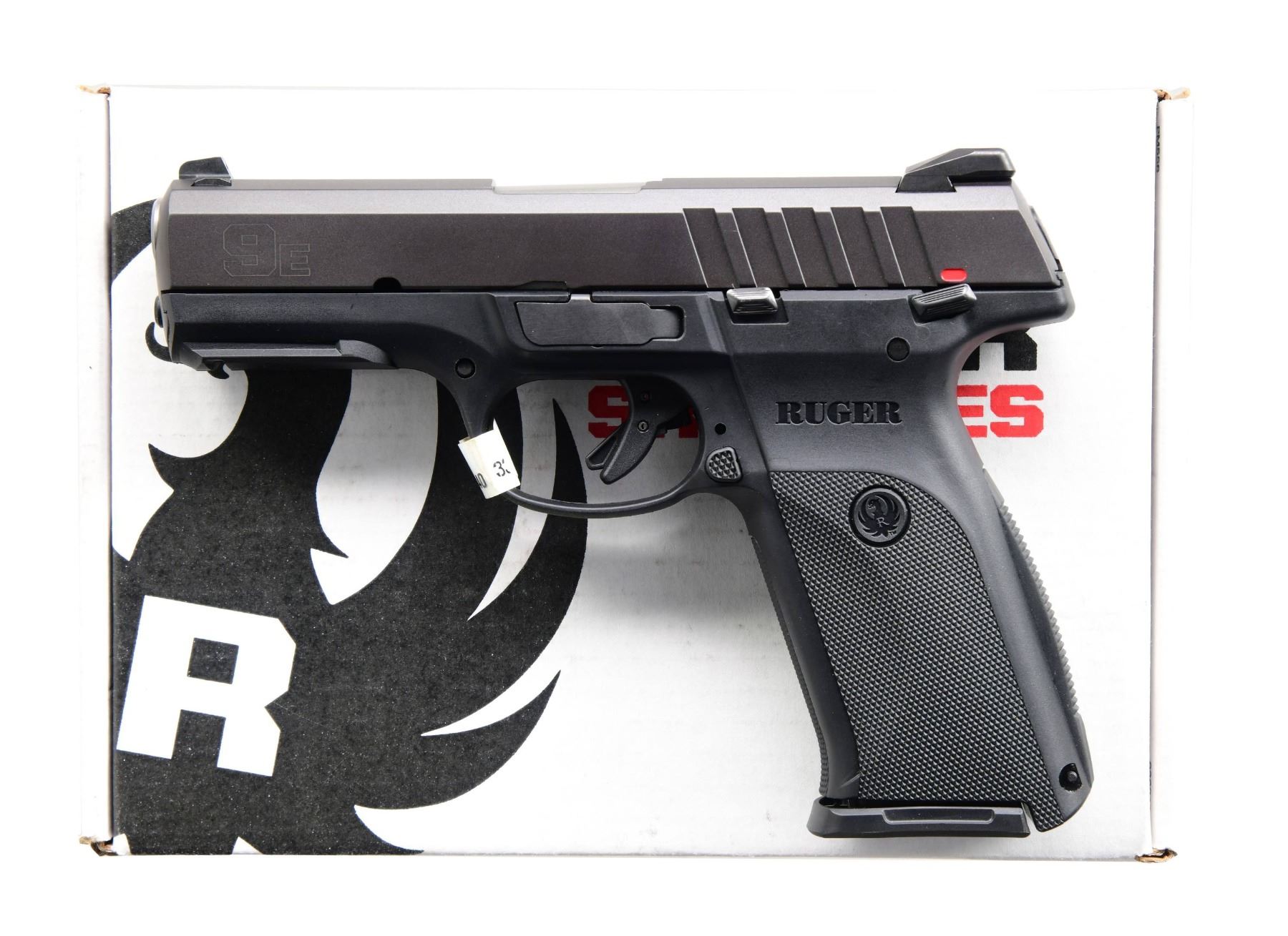 FACTORY BOX. Cal. 9x19mm. S# 338-12744. Bbl. 4". Model 9E semi-automatic pistol mfg. by Ruger in 2017. Left side of slide is marked "9E," with Ruger's mfg. information and logo marked on the right. Slide exhibits a matte black finish, with the stainless steel bbl. exhibiting a satin finish. Checkered black polymer frame. Three-dot iron sights. MAGS: one 17-rd. UNATTACHED ACCESSORIES: matching factory box containing factory paperwork. CONDITION: near new, with metal components retaining virtually all of their original factory finishes overall. Mirror bore, exhibiting what appears to be grease while retaining well-defined rifling throughout. Polymer frame is excellent. Box shows some light exterior wear from handling and storage but otherwise remains sturdy and serviceable. (24-2914/MLW). MODERN. $200-300.