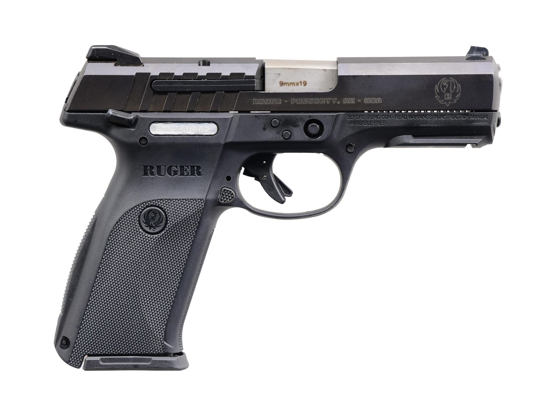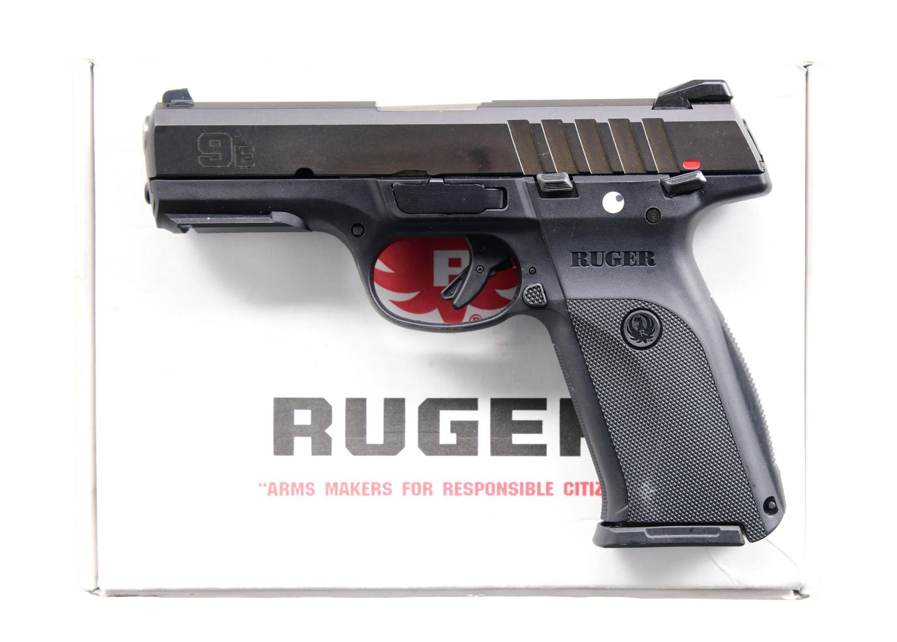 FACTORY BOX. Cal. 9x19mm. S# 335-40462. Bbl. 4". Model 9E semi-automatic pistol mfg. by Ruger in 2014. Left side of slide is marked "9E," with Ruger's mfg. information and logo marked on the right. Stainless steel bbl. is marked with the cal. designation on the right side of the chamber. Slide exhibits a black oxide finish. Checkered black polymer frame. Three-dot iron sights with a two-stage trigger. MAGS: one 17-rd. UNATTACHED ACCESSORIES: matching factory box containing factory paperwork. CONDITION: near new, with metal components retaining virtually all of their original factory finish overall. Mirror bore, exhibiting well-defined rifling throughout. Polymer frame is excellent overall. Box exhibits light exterior wear and some staining, but otherwise remains sturdy and serviceable. (24-2918/MLW). MODERN. $200-300.