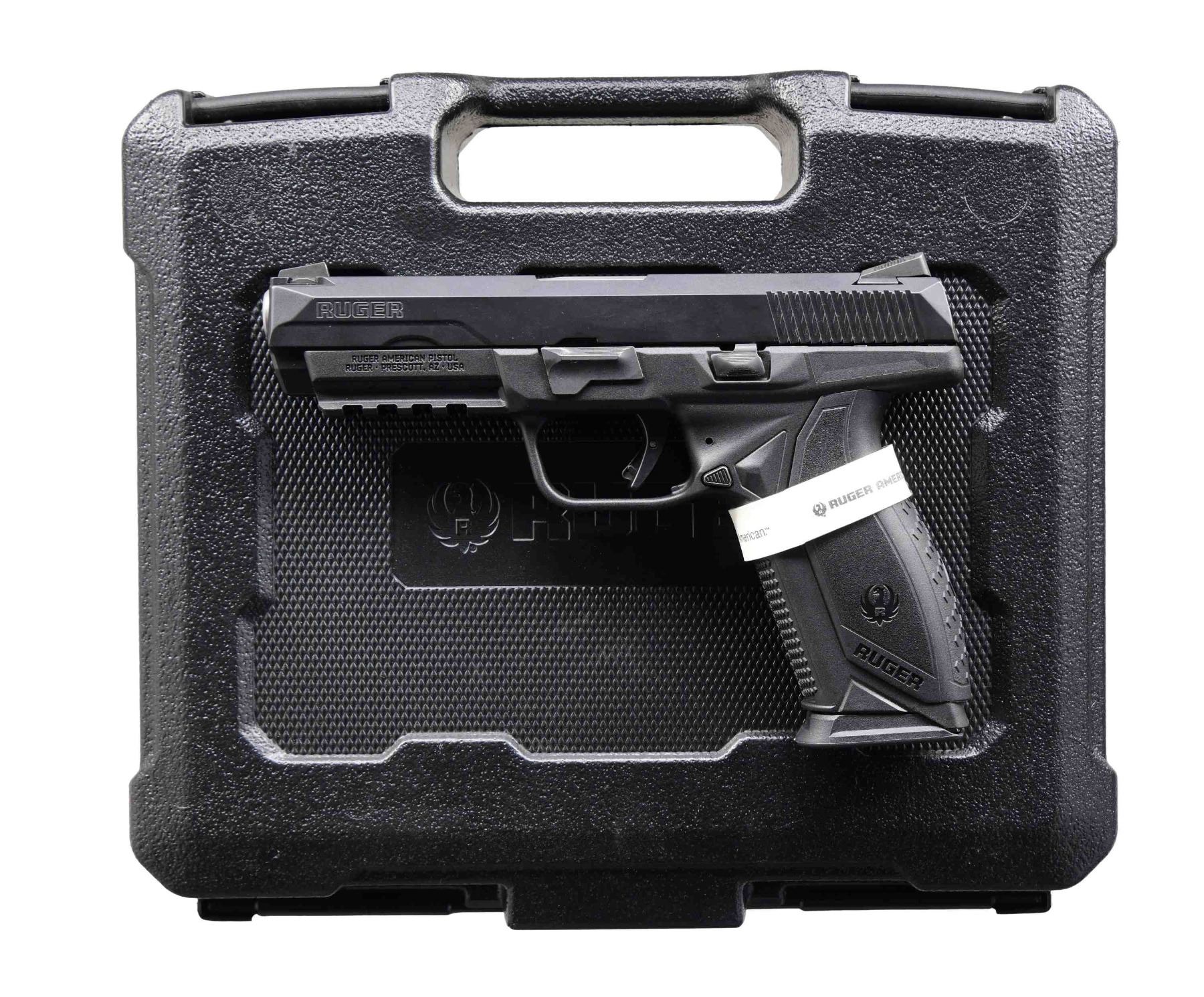 MATCHING FACTORY CASE. Cal. 45 ACP. S# 861-06654. Bbl. 4 3/8". American Pro Duty semi-automatic pistol mfg. by Ruger in 2016. Sides of the slide are marked "RUGER," with the cal. designation marked on the side of the chamber. Left side of frame is marked "RUGER AMERICAN PISTOL" above Ruger's mfg. information. Slide exhibits a black oxide finish, with the stainless steel bbl. exhibiting a satin finish. Textured black polymer frame, with two-stage trigger. Three-dot iron sights. MAGS: two 10-rd. UNATTACHED ACCESSORIES: matching factory case, containing spare mag., spare grip extension, and factory paperwork. CONDITION: near new, with metal components retaining bountiful amounts of their original factory finish overall. Mirror bore, exhibiting well-defined rifling throughout. Polymer frame is excellent overall. Case is very good. (24-3454/MLW). MODERN. $300-500.