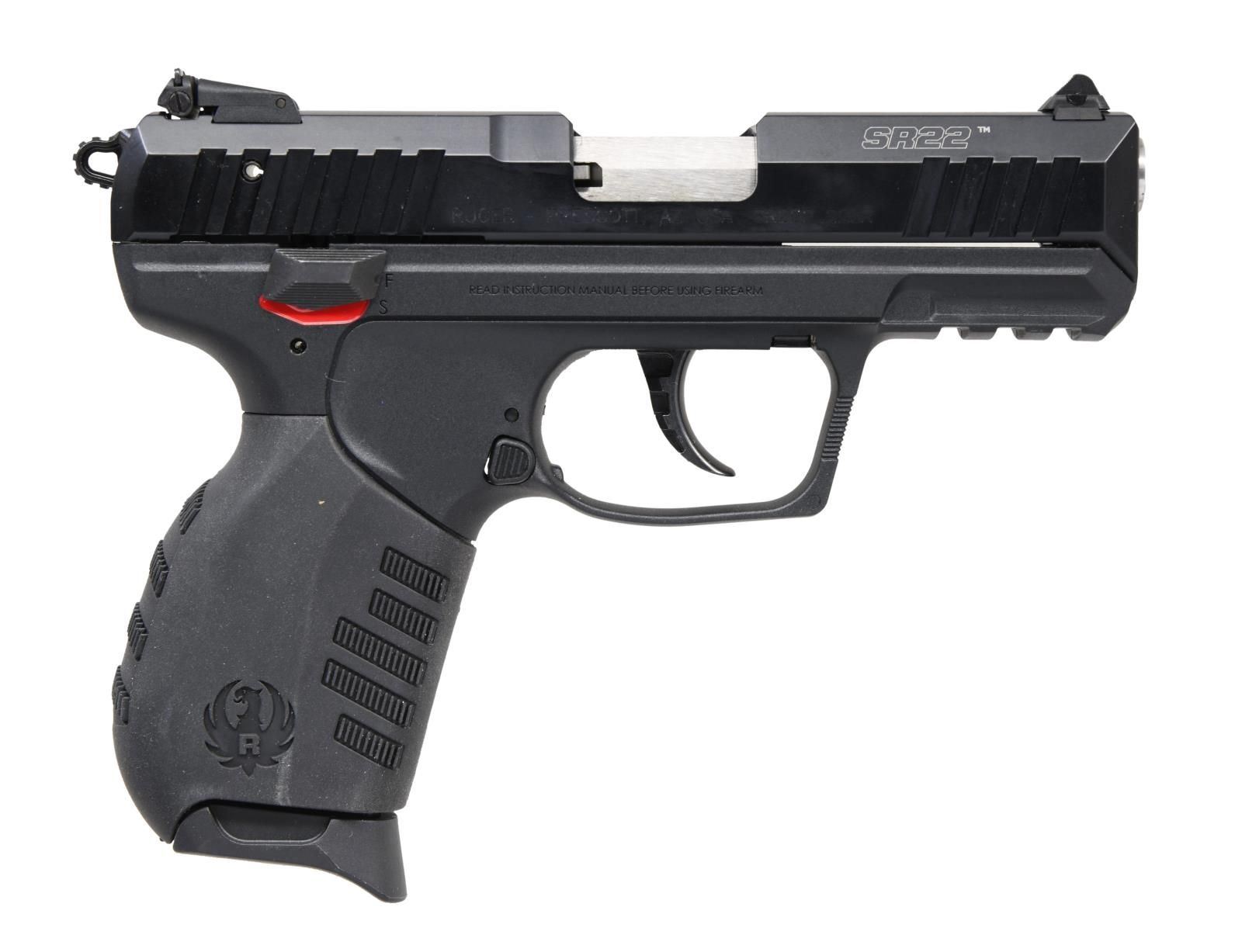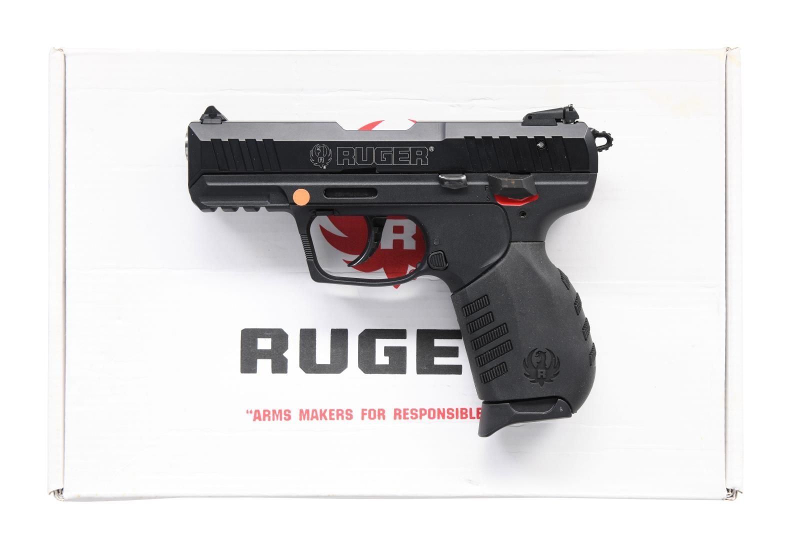 Cal. 22 LR. S# 361-87604. Bbl. 4.5" stainless. Mfg. 2013 (2012 to date) in Mayodan, NC as Model 03600 with matte finish and catalog number SR22PB. Polymer frame with changeable backstrap (large installed), Picatinny accessory rail, magazine safety, plus ambidextrous manual safety and magazine release. Aluminum slide with front and rear cocking grooves, plus dovetailed 3-dot sights; adjustable rear. MAGS: 2 factory 10 rd. with flat and finger extension push button plastic bases. UNATTACHED ACCESSORIES: factory box and packaging to include spare small back strap and Ruger black nylon zippered pouch. CONDITION: all aspects near excellent; appears new and unfired, with orange inspection sticker still on frame. (23-7173/NW). MODERN. $250-350.