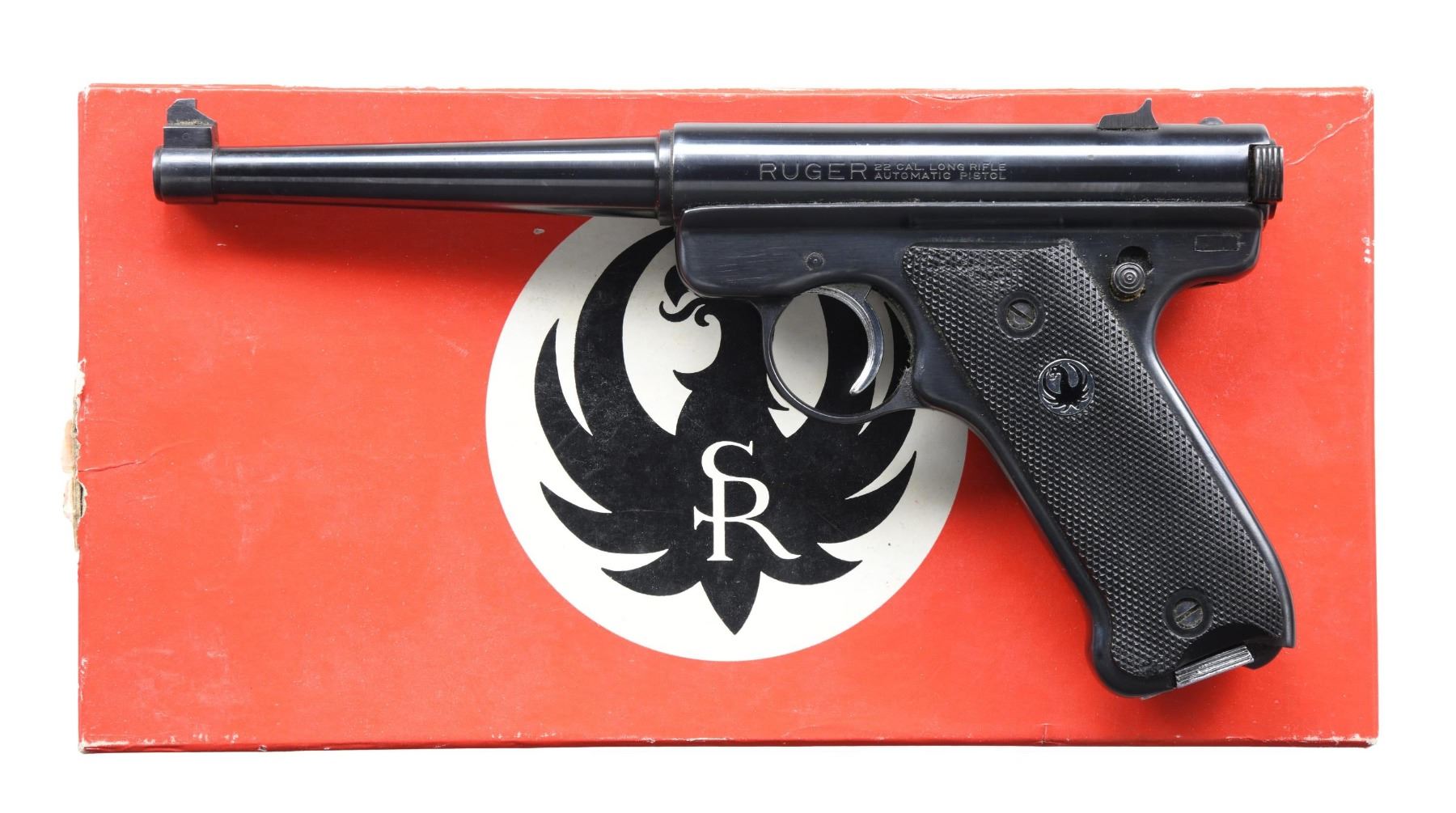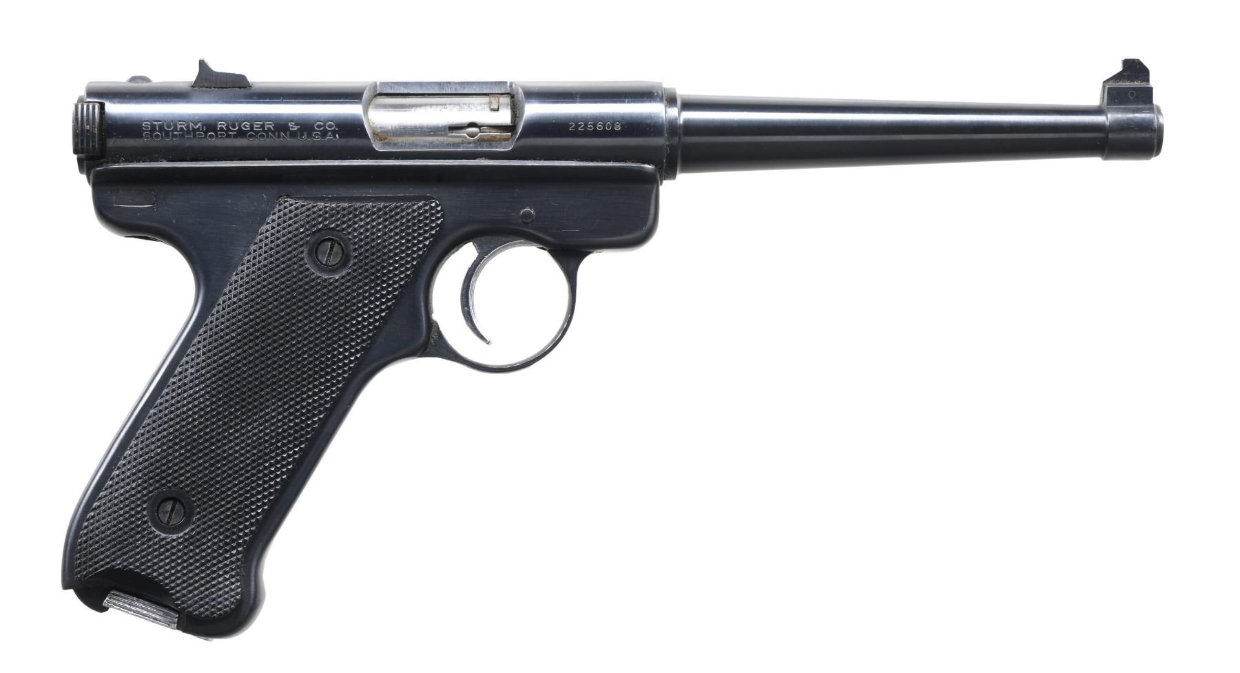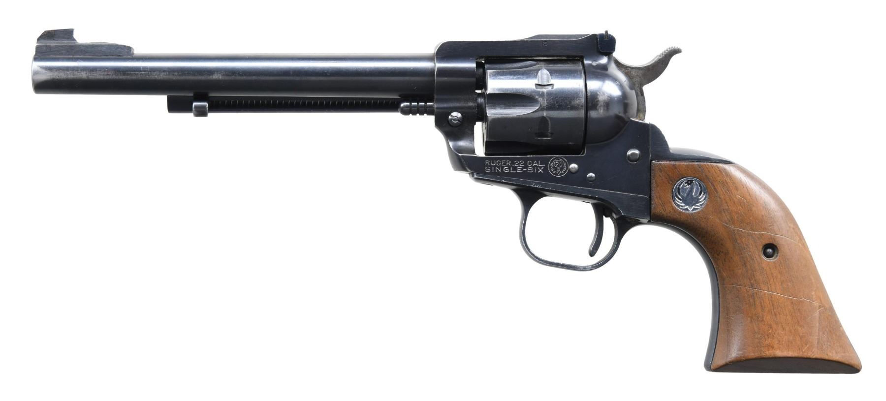 This lot consists of the following Ruger handguns both in Cal. 22 LR: 1) RUGER SINGLE SIX SA REVOLVER. S# 547373. Bbl. 6 1/2". Blade front sight. Adjustable square notch rear sight. Revolver does not have a transfer bar update. Blued and anodized finishes. Smooth hardwood grips with silver Ruger medallions. CONDITION: grip medallions show notable flaking of the black paint. Grips show scattered scratches, most notably on the left panel and handling marks. Metal retains 80% blue and anodized finishes with some light oxidation, scattered flaking, fading, and edge wear. Action functions properly when hand-cycled. Very good+, bright bore. (24-3862/MJC). 2) 24-3872 RUGER STANDARD PISTOL. S# 225608. Bbl. 6". Blade front sight. Square-notch rear sight. Mfg. 1962. Blued finish. Checkered black grips with silver Ruger medallion on left panel. MAGS: one 10 rd. UNATTACHED ACCESSORIES: factory box that is pencil matching-numbered on side and Ruger Mark I manual. CONDITION: grips show some checkering wear from handling. Metal retains 97% original blue with some light edge and handling wear. Action functions properly when hand-cycled. Very good+ bore. (24-3872/MJC). BOTH CURIO. $450-750 for pair.