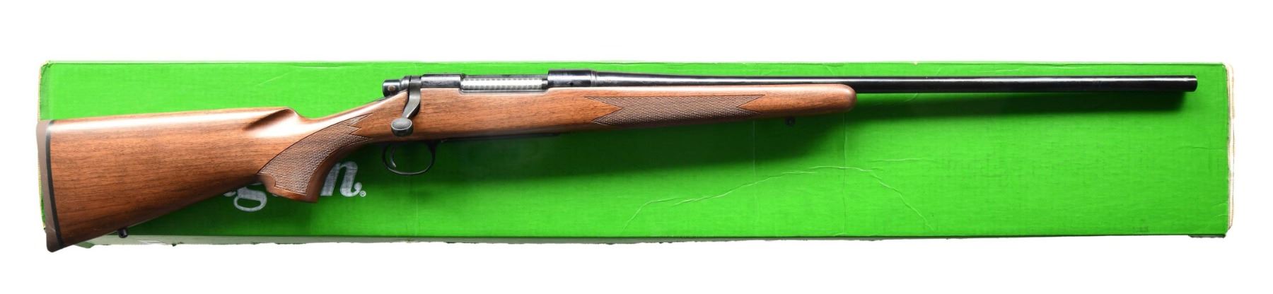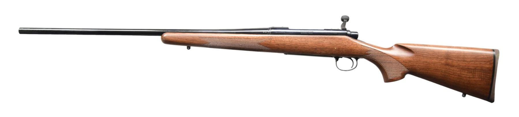 Cal. 257 Roberts S# B6395631. Bbl. 24". No iron sights are present, but the receiver is factory drilled and tapped for scope mounting. Blued finish. Checkered pistol grip walnut stock with bottom-mounted sling studs and factory recoil pad. LOP: 13 1/2". UNATTACHED ACCESSORIES: matching-numbered factory box with manual. CONDITION: all aspects are near new; in the box. (24-3086/MJC). MODERN. $350-550.