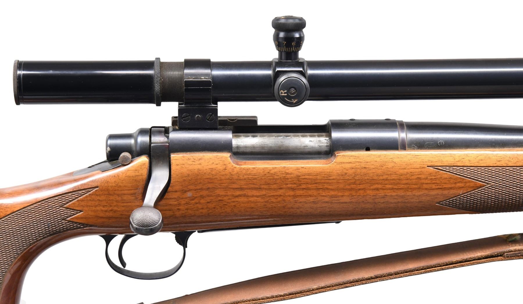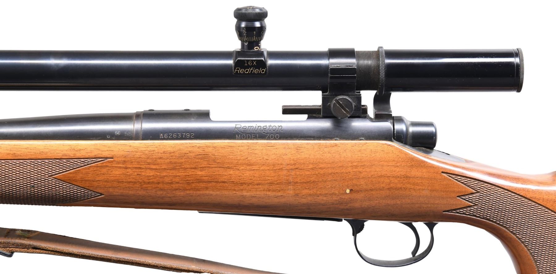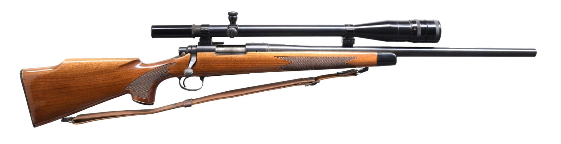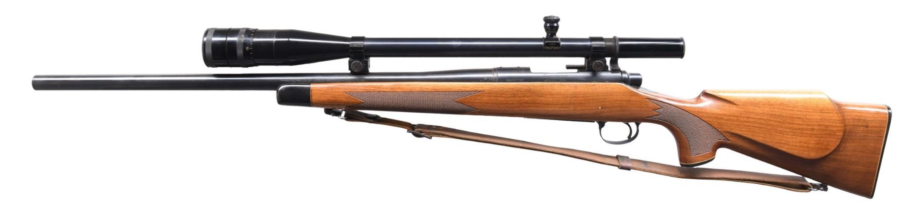 RIFLE. Cal. 222 REM. S# A6263792. Bbl. 24" Heavy bbl with no provisions for open sights, however the forward mount that holds the Redfield 16x Target scope tapped was tapped into it. The rear block utilizes the rear factory tapped holes in the receiver. Machine turned bolt. Checkered pistol grip Monte Carlo walnut stock with QD sling swivels and leather sling. CONDITION: Very fine metal finish with only a few miniscule handling marks. Great stock has a couple of minor blemishes. Very good bright shiny bore with sharp rifling. Great optics. MODERN (24-4282/ZAL) $1000-1500