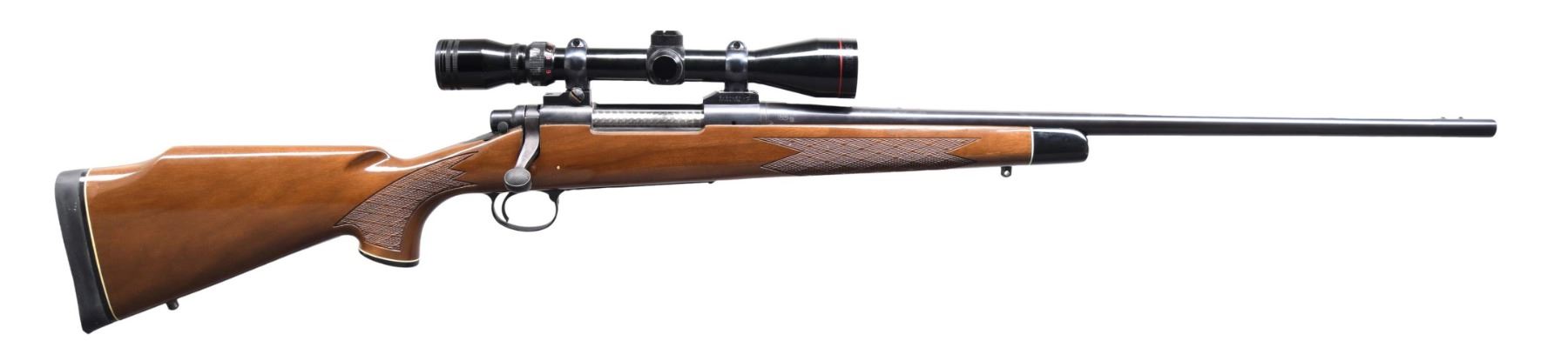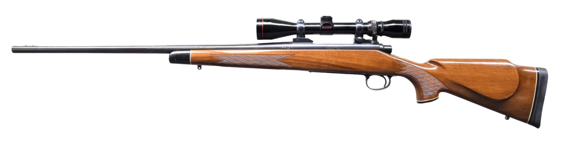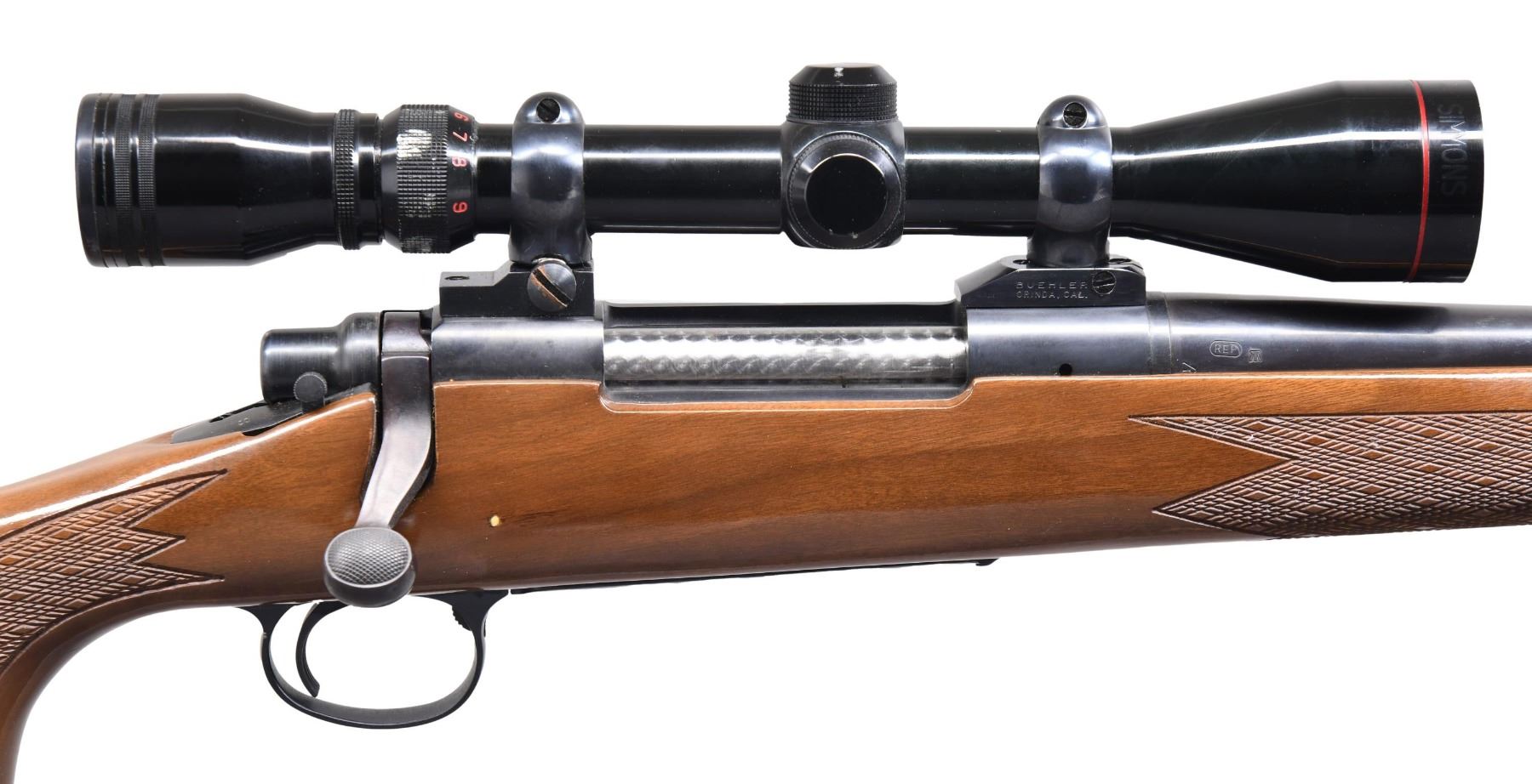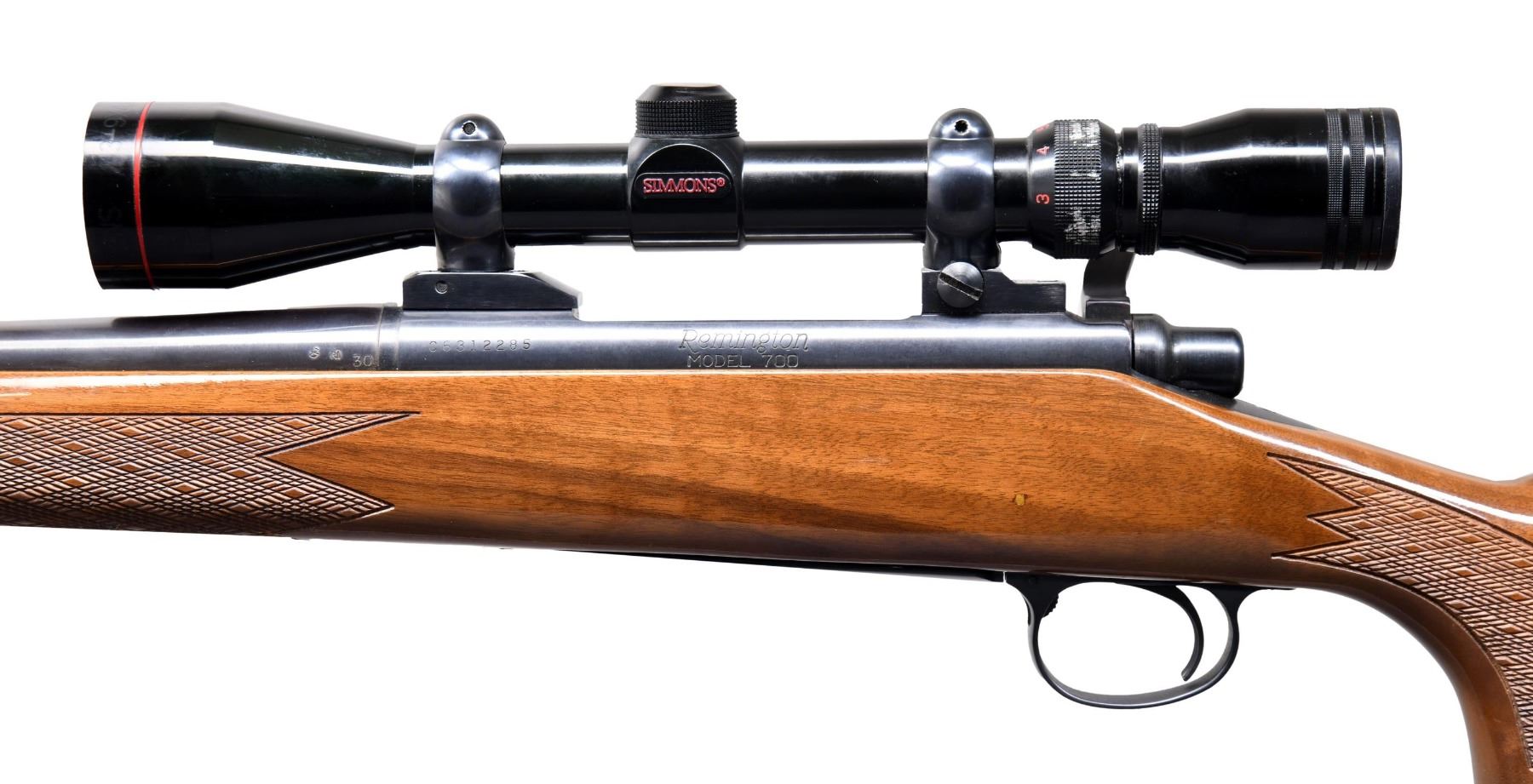 Cal. 338 Win Mag. S# C6312285. Bbl. 24" with screw plugged factory tapped barrel sight holes. Simmons 3-9x40 duplex reticle scope. Checkered walnut pistol grip stock set with Monte Carlo cheek rest, sling studs and Remington rubber recoil pad. CONDITION: Extremely fine metal surfaces with only a couple of miniscule handling marks. Stock is in very good condition and only has a couple of dents and a small heavy dent just behind the trigger guard not visible from the side profile and some very small amounts of bubblin of the varnish on the forarm cap. Scope has some marring on the adjustment knob from where someone improperly used a wrench to force the scope to turn. The scope adjustment does not currently rotate all the way to the 3 or 9. Good clear optics. Great bore with sharp rifling. MODERN (24-4355/ZAL) $700-1000