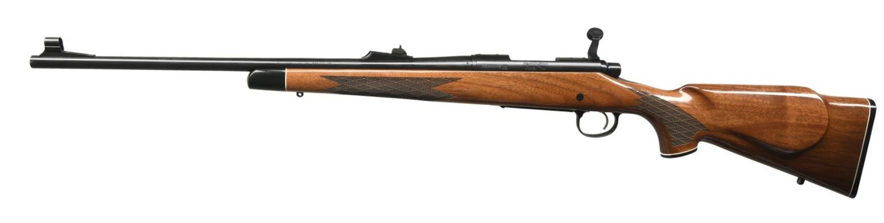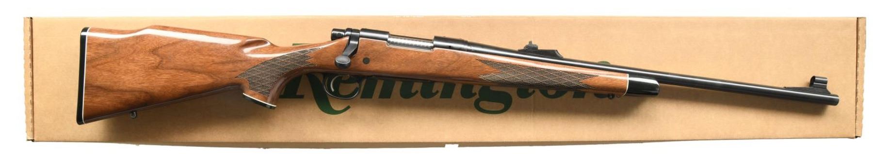MATCHING FACTORY BOX. Cal. 243 Win. S# RAR077037. Bbl. 22". Model 700 BDL bolt action rifle mfg. by Remington. Left side of bbl. exhibits the cal. designation, with the S# and model on the left side of the receiver. Metal components exhibit a blued finish overall. 1-Piece, checkered wood pistol grip. Monte Carlo pattern stock. Ramped & hooded blade front sight w/ adjustable U-notch rear sight. UNATTACHED ACCESSORIES: matching factory box. CONDITION: near new, with metal components retaining virtually all of their original factory finish overall. Mirror bore, exhibiting a layer of factory grease and exhibiting well defined rifling throughout. Wood stock is excellent. Box shows some mild wear from handling & storage, but otherwise remains sturdy & serviceable. PROVENANCE: the Collection of Gun Sport Ltd owned by Jon R. Thomas. (23-3169/MLW). MODERN. $600-900.