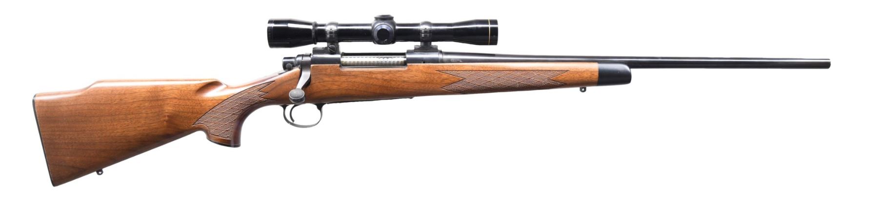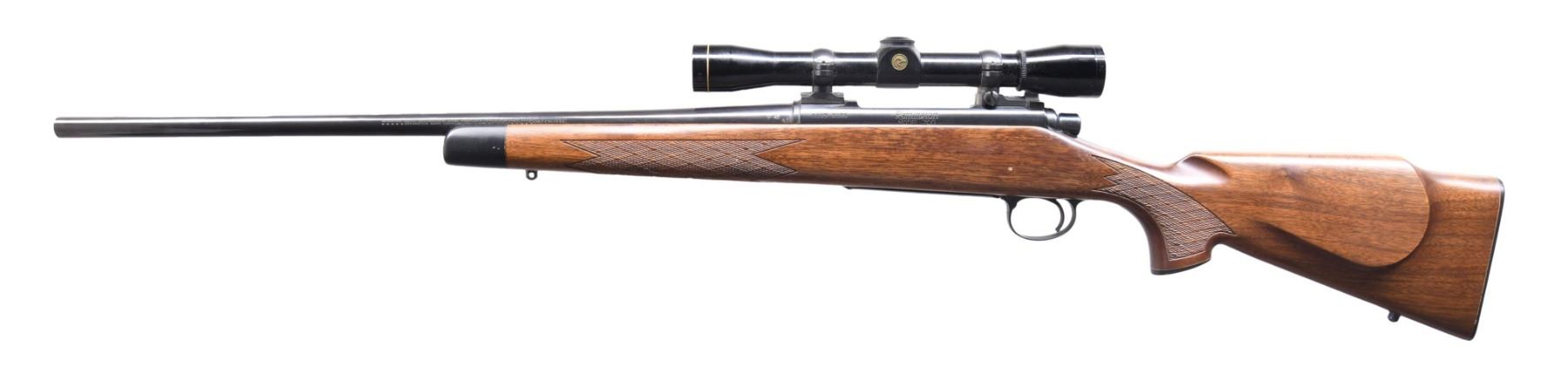 ACTION RIFLE. Cal. 30-06. S# 0393DU85. Bbl. 22" with no provisions for bbl sights. Leupold M8-4x duplex reticle scope. Checkered pistol grip walnut stock with swivel studs. The floorplate is engraved with Ducks Unlimited motif featuring a Whitetail Buck and logo. Machine turned bolt. CONDITION: Overall very fine with excellent metal finish and only a couple of handling marks on the stock. Great optics. Bright shiny bore with sharp rifling. MODERN (24-4142/ZAL) $600-900