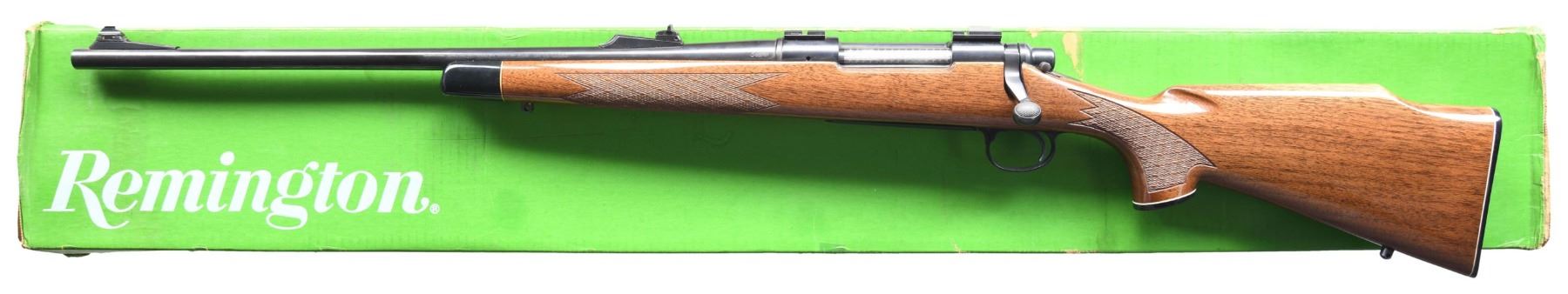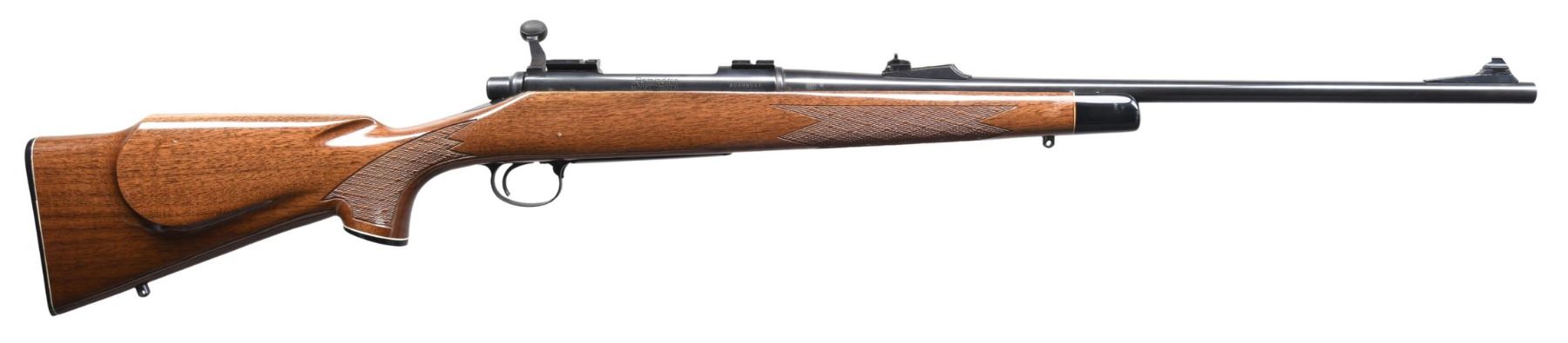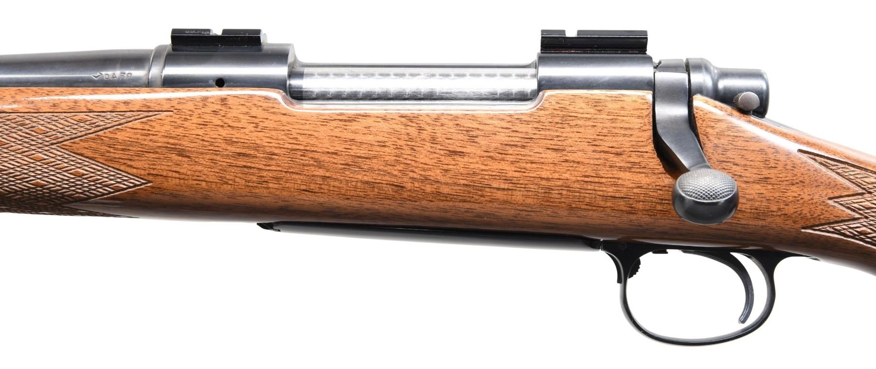 BOLT ACTION RIFLE. Cal. 30-06. S# A6888548. Bbl. 22" with standard crown and factory adjustable sights; missing front sight hood. Mfg. September 1980 as one of last examples to have riveted extractor rather than later snap in style. Other features are: jeweled finish on bolt body, skip line checkering (wrap around pattern on forend), gloss finish, black accents with white spacers, sling studs, 1 piece 4 screw buttplate with checkered inner panel (simulated skeleton style), Monte Carlo cheekpiece, trigger guard assembly with hinged floorplate and slotted head screws plus adjustable trigger. Fitted with Weaver scope bases. A classic American sporting rifle famous for its accuracy and left handed. UNATTACHED ACCESSORIES: unmarked factory box without packaging. CONDITION: all aspects near excellent including bore; only the faintest of use showing up as bolt wear. (24-4333/NW). MODERN. $550-800.