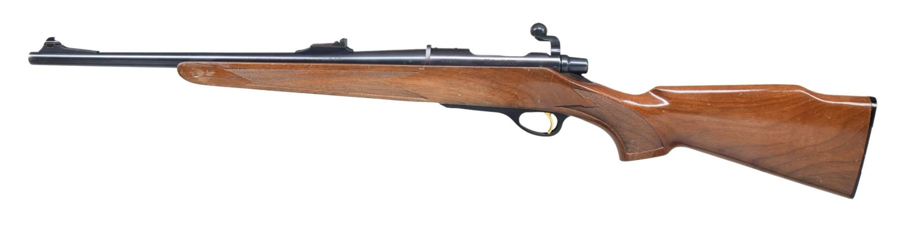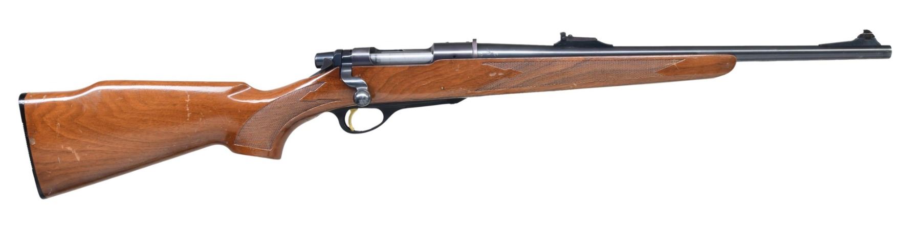 Cal. 243 Win. S# 6744391. Bbl. 18 1/2". Brass bead front sight. Adjustable rear sight. Blued finish with gold trigger. Checkered hardwood stock with factory grooved recoil pad. UNATTACHED ACCESSORIES: dummy 243 Win. rd. and Leupold scope mount. CONDITION: left side of stock has prominent 8" repaired crack at left front; stock otherwise shows scattered flaking varnish, dings, and handling wear. Metal retains 90% original blue with scattered edge wear and oxidation specks. Action functions properly when hand-cycled. Very good+, bright bore. (24-3158/MJC). MODERN. $400-600.