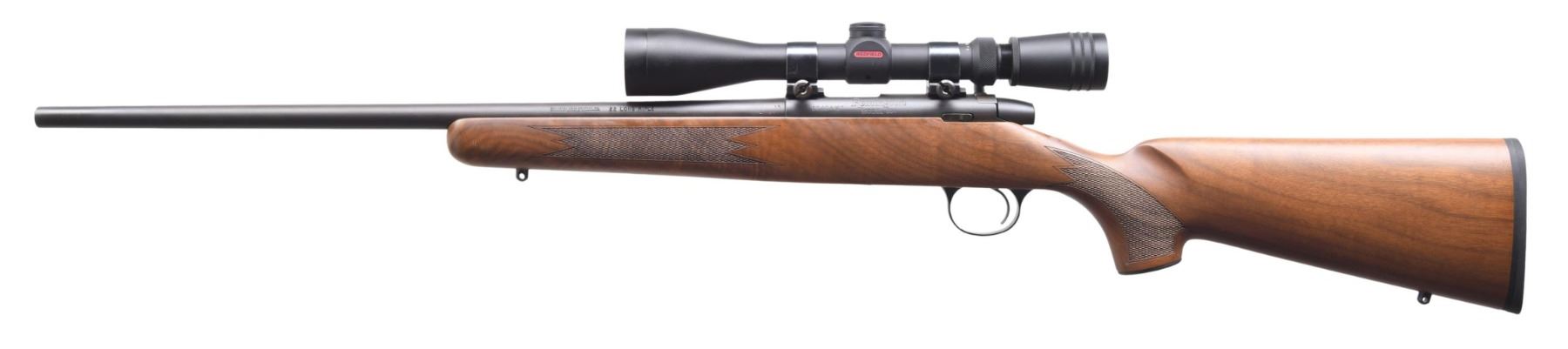 . Cal. 22 LR. S# 50404167. Bbl. 20 1/2" with no provisions for sights. Redfield 4-12x40 duplex reticle scope. Matte metal finish. Checkered pistol grip walnut stock with sling studs. UNATTACHED ACCESSORIES: Original box. CONDITION: Overall excellent with no significant mars to the metal finish. Stock is excellent with the exception of a bit of scuffing at the wrist. Fine optics. Great bore. MODERN (24-4254/ZAL) $500-750