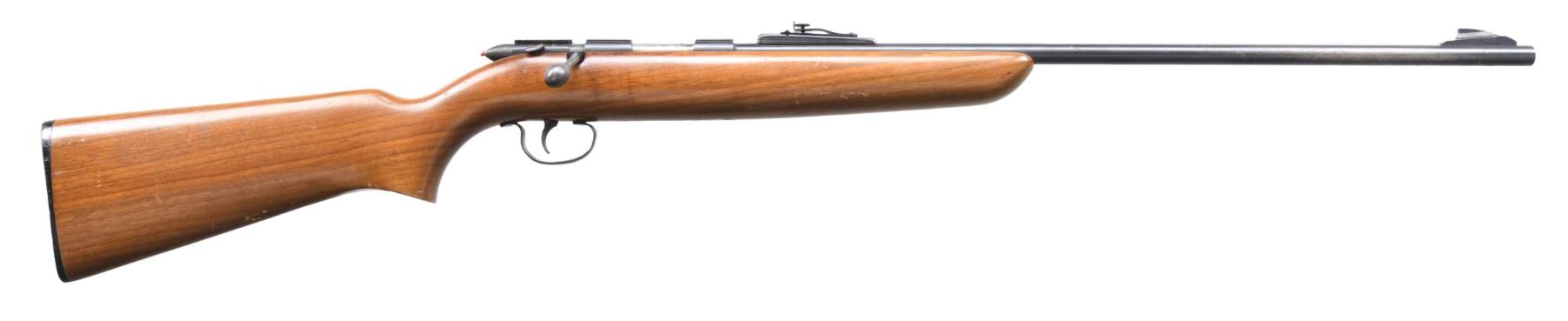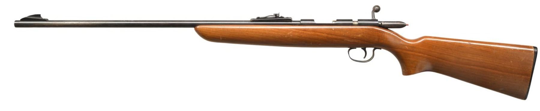 BOLT ACTION RIFLE. Cal. 22 S, L, LR. NSN. Bbl. 24". Model 510-X Targetmaster single shot bolt action rifle mfg. by Remington Arms Co. The top of the bbl. is marked with Remington's mfg. information, followed by the Remington trademark logo, as well as the model and cal. designations. Metal components exhibit a blued finish. 1-Piece smooth wood pistol grip buttstock with checkered black plastic buttplate. Blade front sight with square notch rear sight. CONDITION: metal components retain good amounts of their original factory blue finish, exhibiting some areas of wear, with surface oxidation ranging from light to mild in severity present overall. Mirror bore, strong rifling throughout. Stock exhibits scattered marks and minor impressions from handling and storage, but otherwise remains sturdy and serviceable. (24-8/MLW). CURIO. $100-150.