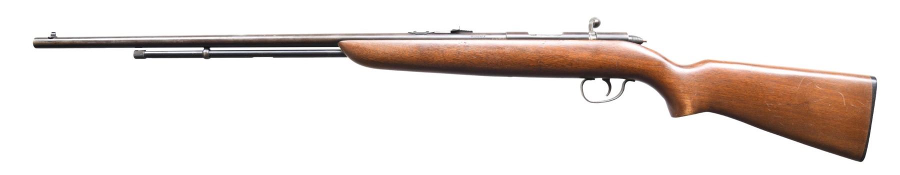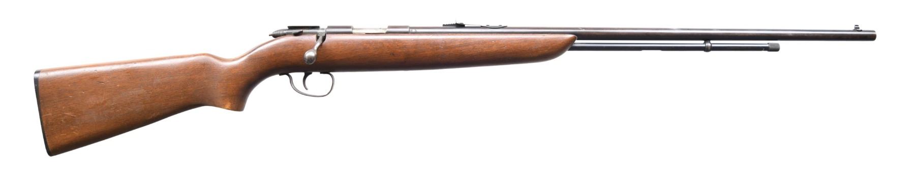 Cal. 22 S, L, LR. S# NSN. Bbl. 24" with dovetailed bead front sight. Elevator ramp U notch rear sight. 3/4 Tubular magazine. Smooth walnut stock with checkered Remington hard rubber butt plate. CONDITION: thinning metal finish with a thumbprint size patch of wear from a gun rack on the bbl and scattered scratches. Stock is good with scattered handling marks and scratches. Bright bore with good rifling. CURIO (24-4393/ZAL) $100-200