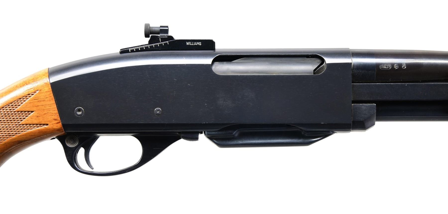 ACTION RIFLE. Cal. 35 Rem. S# 456673. Bbl. 22". Ramped bead front sight. Adjustable sporting rear sight on bbl. Additional receiver-mounted Williams aperture rear sight. Receiver has two additional vacant holes for sight mounting. Early press, checkered example in a very desirable caliber. Blued finish. Press checkered pistol grip stock and forend. MAGS: one 4 rd. CONDITION: stock shows a few light scratches and some scattered handling marks. Metal retains 97% original blue with some light edge and operational wear. Action is functional when hand-cycled. Bright, near excellent bore. (24-2820/MJC). CURIO. $800-1,200.