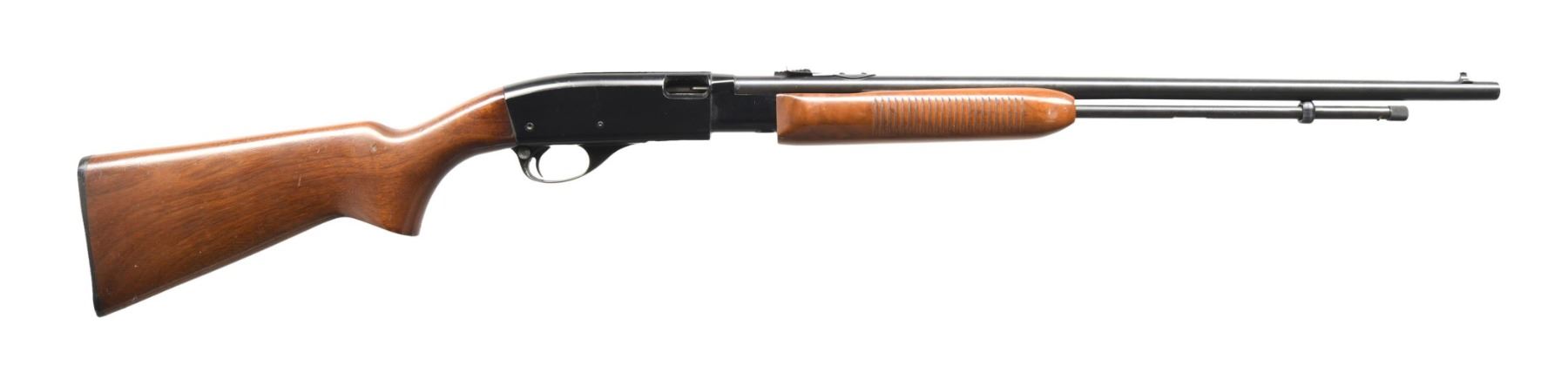 Cal. 22 S, L, LR. S# 1471687. Bbl. 21" with dovetailed bead front sight. Elevator ramp U-notch rear sight. Grooved receiver. Serrated forearm. Smooth pistol grip stock. Checkered hard rubber Reminton buttplate. CONDITION: overall very good+ with some minor muzzle wear and a couple of mild rub marks. Very good stock set with some handling marks and a few moderate dents on the butt. Bright, shiny bore with distinct rifling. (24-5892/ZAL). MODERN. $200-300.
