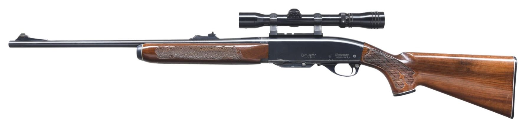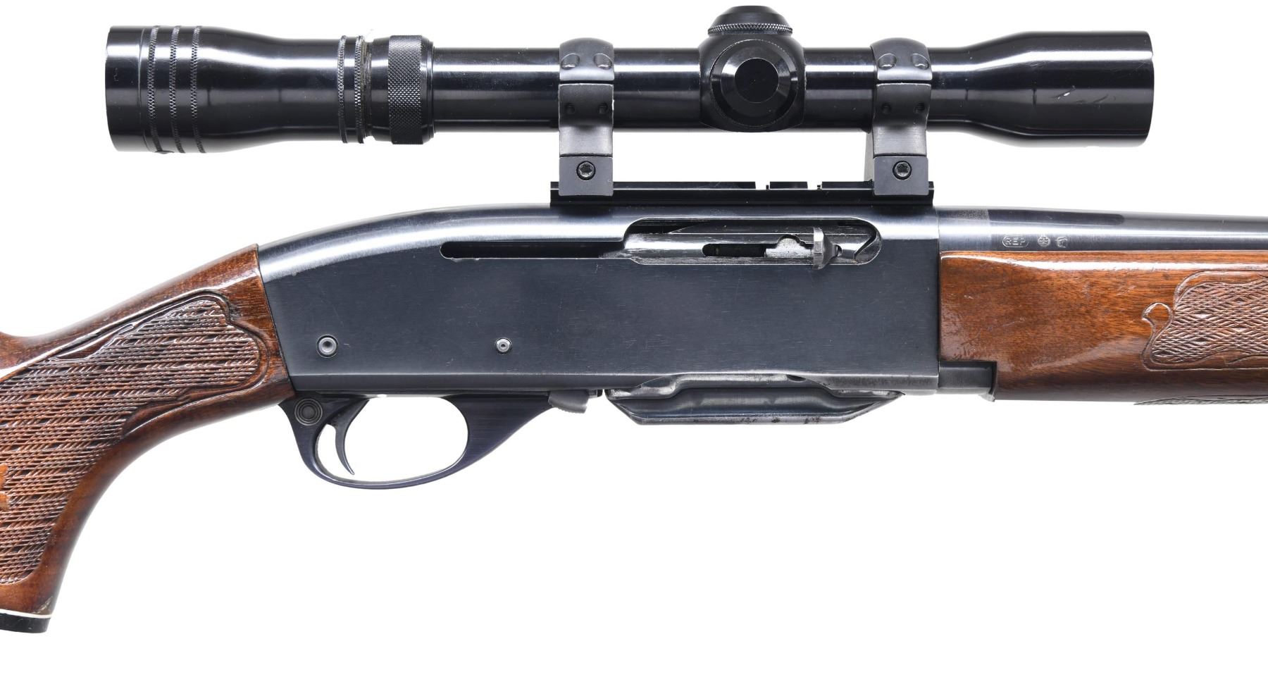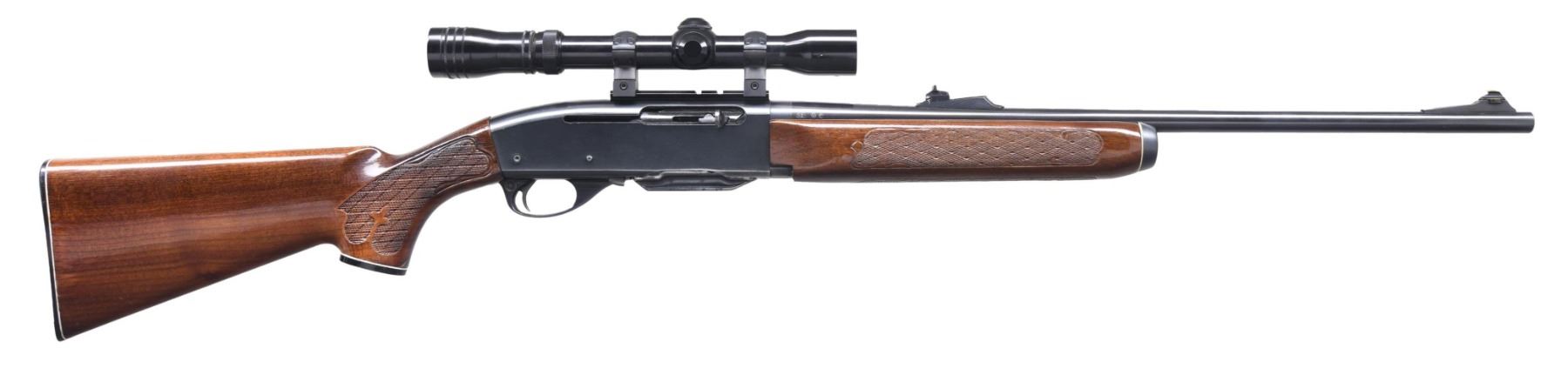 Cal. 30-06. S# B7063830 (EQ = Oct. 1978). Barrel 22". Blade front sight & adjustable notch rear sight. Redfield 2x-7x Wideview scope with duplex reticle on Weaver base & alloy rings. Gloss finished press checkered walnut stock set. MAGS: 1 - 4 rd. CONDITION: good blue with silvering in carry ears, marks & pinprick oxidation. Good wood finish with marks & areas of worn finish. Shiny bore with strong rifling. (24-5207/MD). MODERN. $300-500.