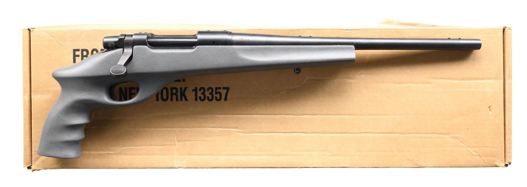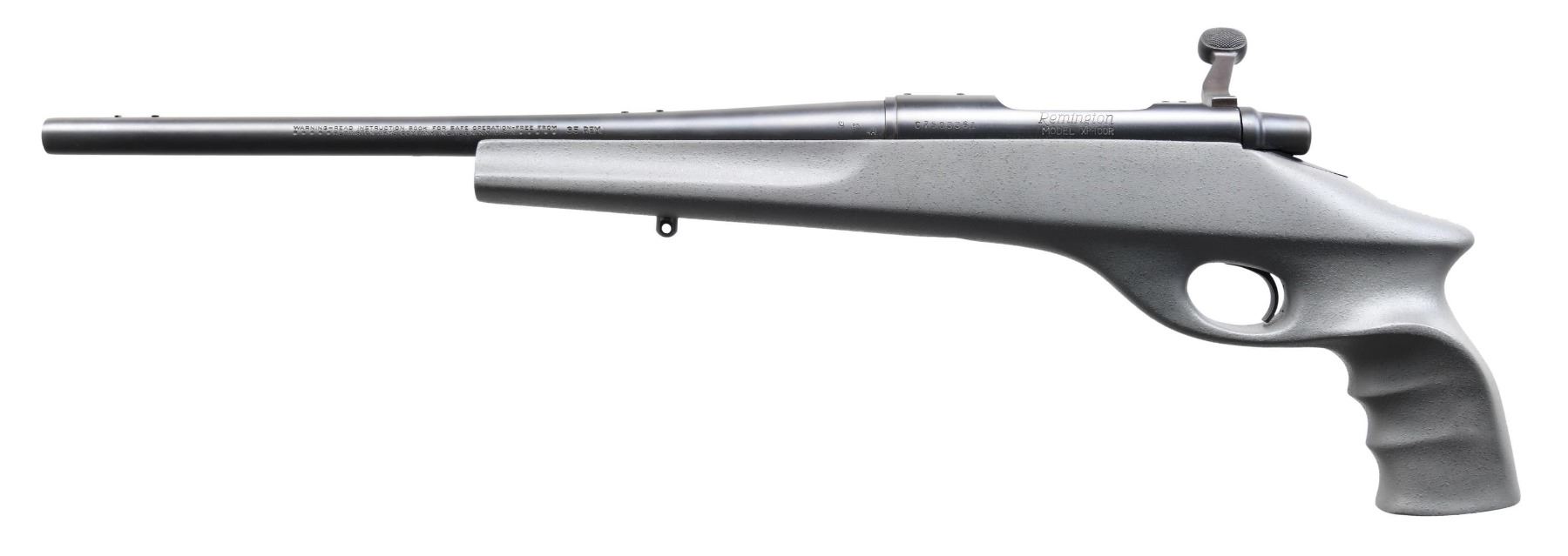 MATCHING FACTORY BOX. Cal. 35 Rem. S# C7503361. Bbl. 14 1/2". Model XP-100R bolt-action pistol mfg. by Remington. Left side of the bbl. is marked with Remington's mfg. information and the cal. designation, with the S#, followed by the Remington trademark logo and the model designation marked on the left side of the receiver. Metal components exhibit a blue finish overall. Textured, gray DuPont Kevlar pistol grip stock. Receiver and bbl. are factory drilled and tapped. UNATTACHED ACCESSORIES: matching factory box. CONDITION: near new, with metal components retaining virtually all of their original factory blue finish overall. Mirror bore, exhibiting well-defined rifling throughout. Stock is excellent. Box shows some light to mild exterior wear but otherwise remains sturdy and serviceable. An extremely fine example of a Remington XP-100R bolt-action pistol. (24-3634/MLW). MODERN. $500-800.
