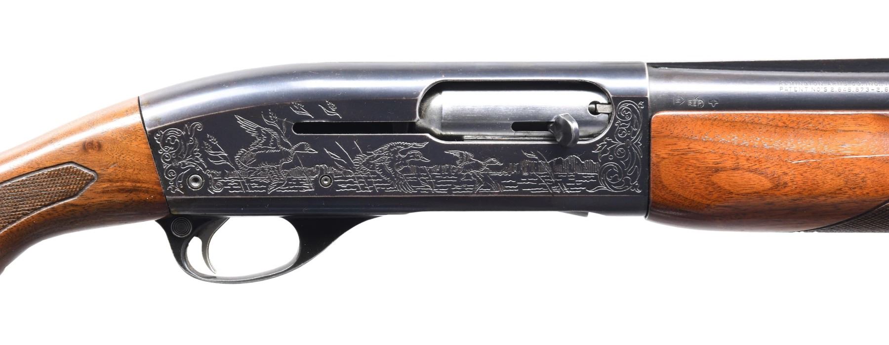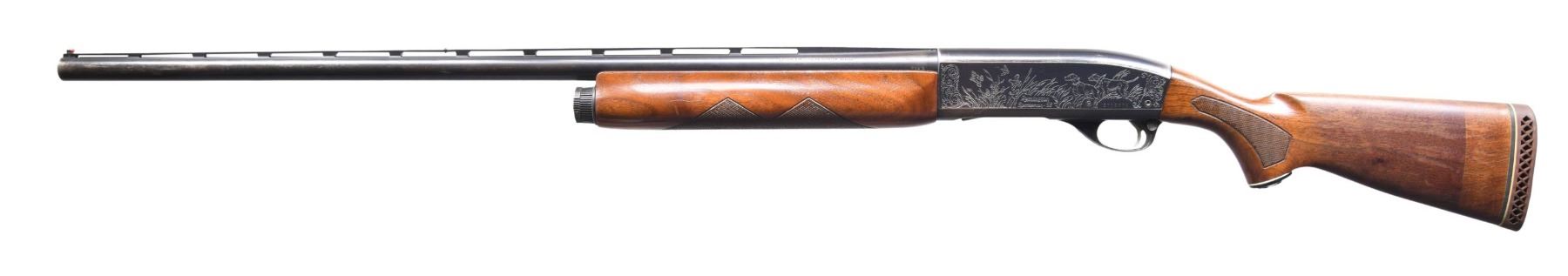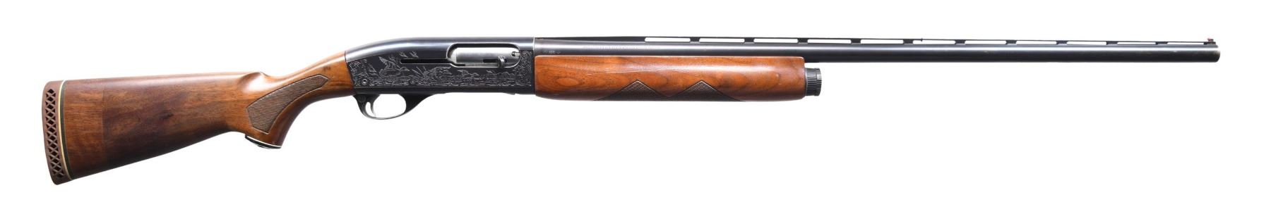 Cal. 12 GA 2 3/4". Full choke. S# 271867V. Bbl. 30" VR with red bead front sight. Brass mid bead. Standard machine engraved reciever. Checkered pistol grip stock set with Whiteline vent recoil pad. CONDITION: Overall fair. Metal finish is fading with muzzle and high edge wear. Butt stock was at one time cut and an extension bringing the LOP to 14" over the recoil pad was added. Good bright bore, but there is a bulgea few inches from the muzzle. CURIO (24-4269/ZAL) $200-400