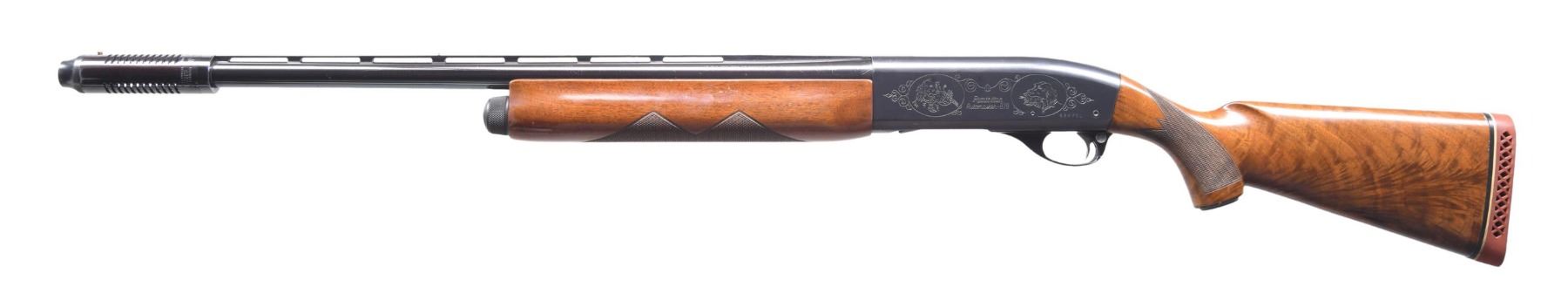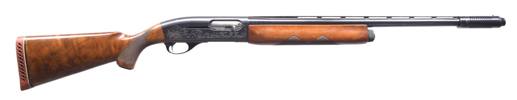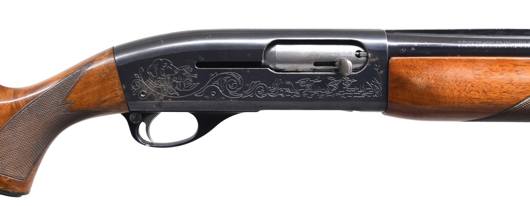 Cal. 12 ga. 2 3/4". S# 62470L. Bbl. 25 1/2" over Cut's compensator with spreader tube featuring a vent rib with brass front and steel mid beads. Gas-operated action. Receiver has scroll ornamentation on sides featuring bird dogs with game and ducks. Original forearm with machine-cut checkering. C-grade stock of fancy walnut with hand checkering and hard rubber grip cap. LOP: shortened to 13 3/4" over a reattached Remington pad. CONDITION: bbl. has 90% brightly polished, reblued finish showing light scratches. Action has 80% original blue showing spots of corrosion with light pitting on right side. Wood has a lightly worn finish, showing scattered light marks. (24-3986/DS). MODERN. $200-300.
