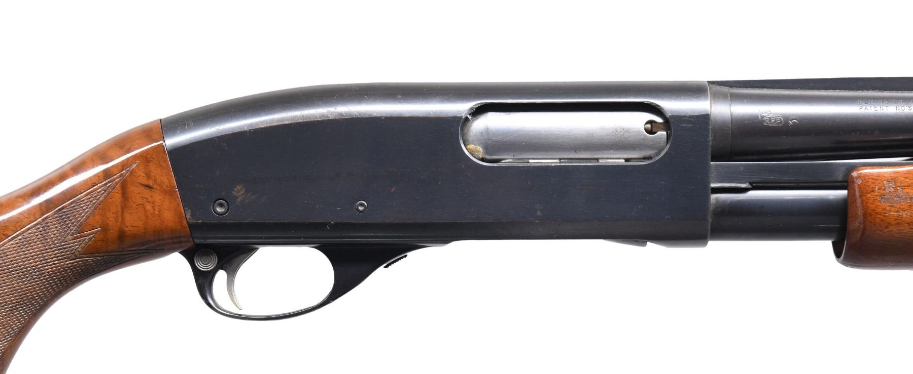 Cal. 16 ga. 2 3/4". S# 589726W. Bbl. 25 1/2" vent rib over aftermarket Cut's compensator w/ spreader tube. Original forearm w/ machine checkering. C grade replacement trap stock w/ fancy walnut w/ hand checkering & hard rubber grip cap. LOP: altered to 14" over a poorly fit Pachmayr presentation pad. CONDITION: over 80% lightly worn blue showing slide wear, handling marks & spots of freckling. Wood finish shows wear & handling marks. Very good bore. (24-3992/DS). MODERN. $200-300.