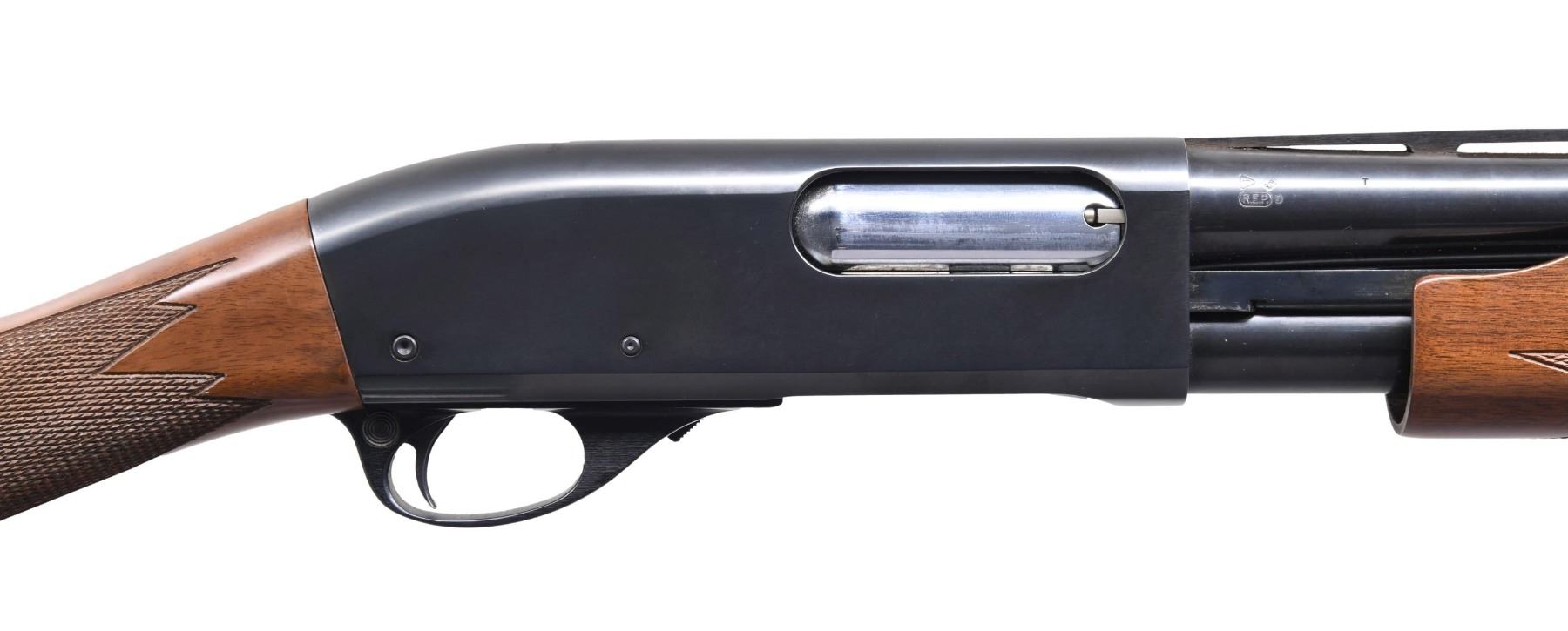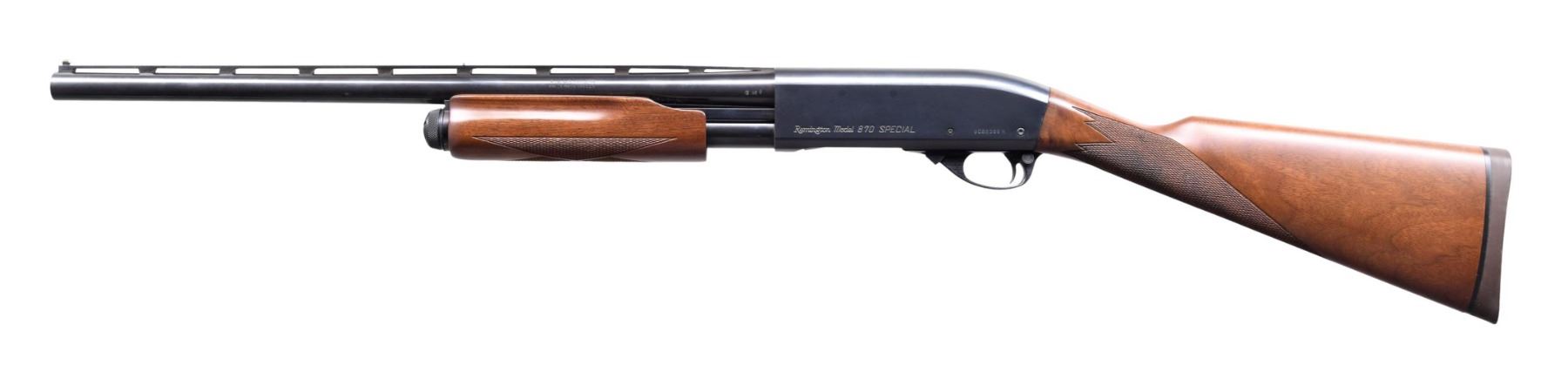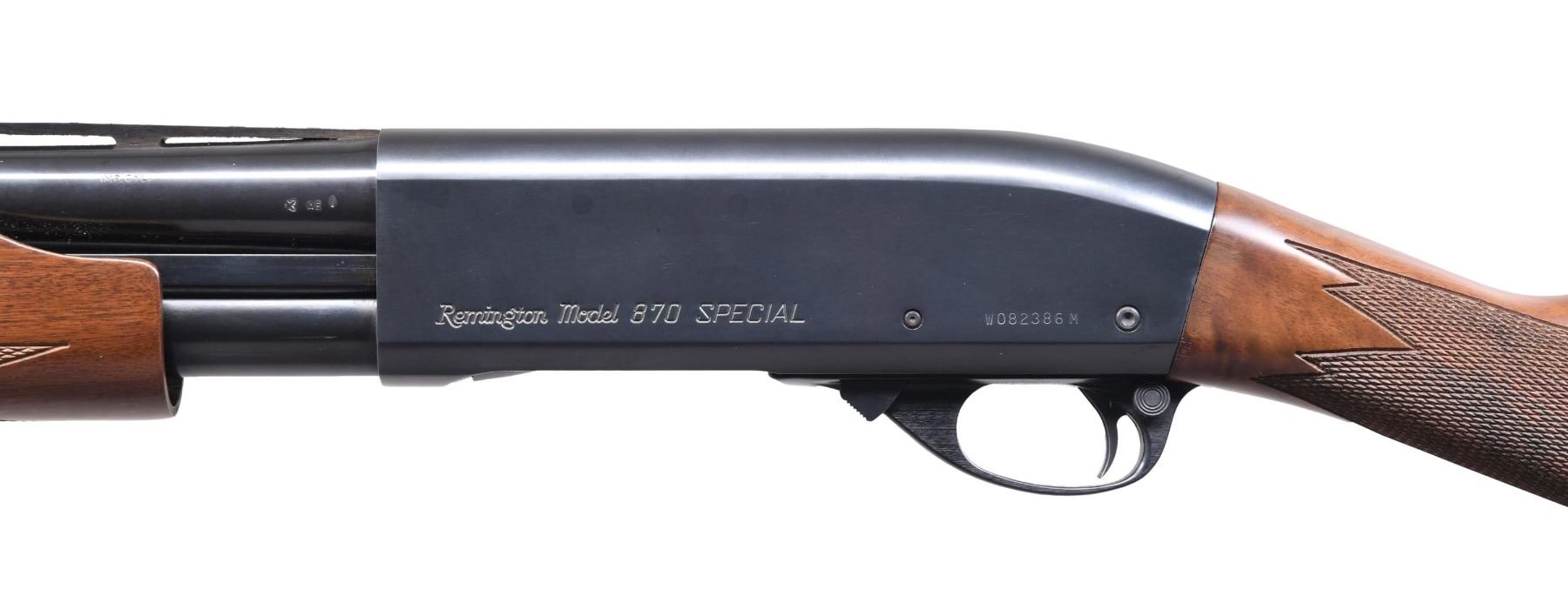 SHOTGUN WITH MATCHING FACTORY BOX. Cal. 12 GA, 2 3/4" & 3". S# W082386M. Bbl. 21". Model 870 Special Field pump action shotgun mfg. by Remington. Left side of the bbl. is marked with the cal. designation, followed by "IMP. CYL." towards the breech, with Remington's mfg. information marked on the right. Left side of the receiver is marked with the Remington trademark logo, followed by "Model 870 SPECIAL" and the S#. Metal components exhibit a blue finish overall, save for the aluminum trigger guard, which exhibits a black anodized finish. Checkered wood straight grip buttstock and pump. Matte V/R with white plastic bead front sight. UNATTACHED ACCESSORIES: matching factory box. CONDITION: extremely fine, with metal components retaining bountiful amounts of their original factory finishes overall. Mirror bore, exhibiting some hardened firing residue towards the muzzle. Wood furniture is excellent overall. Box exhibits mild exterior wear from handling and storage but otherwise remains sturdy and serviceable. (24-3841/MLW). MODERN. $300-450.