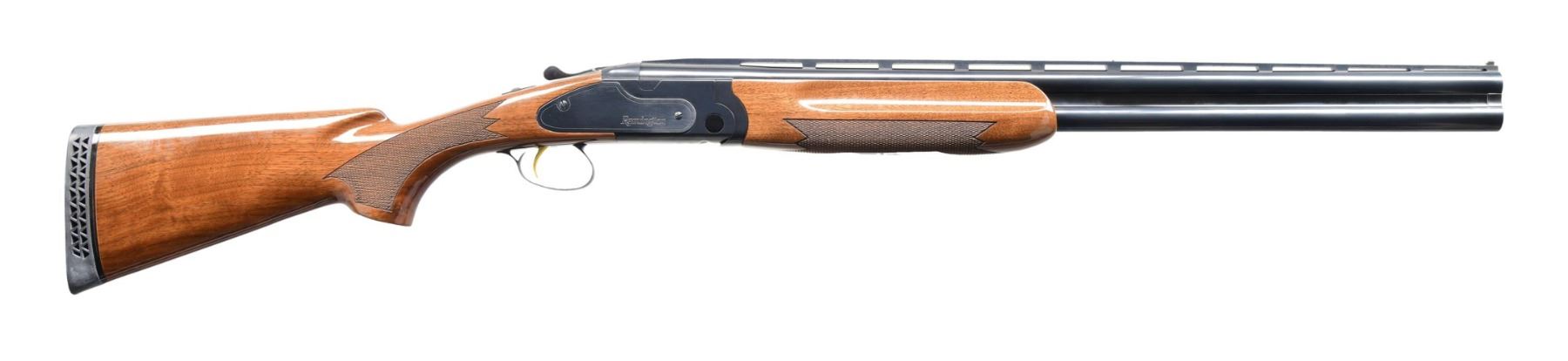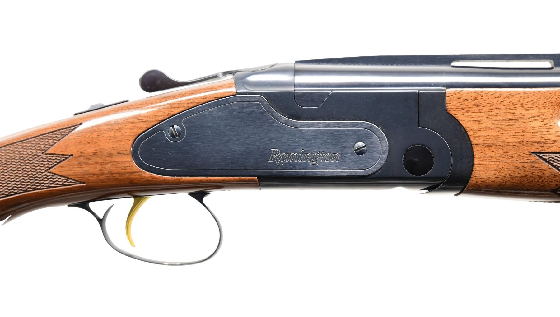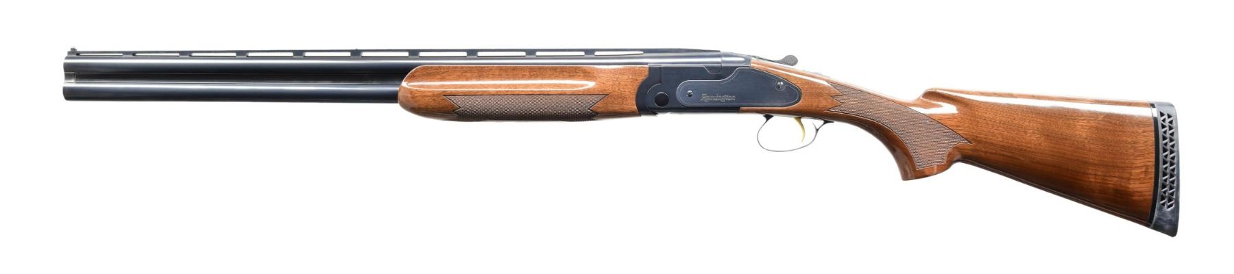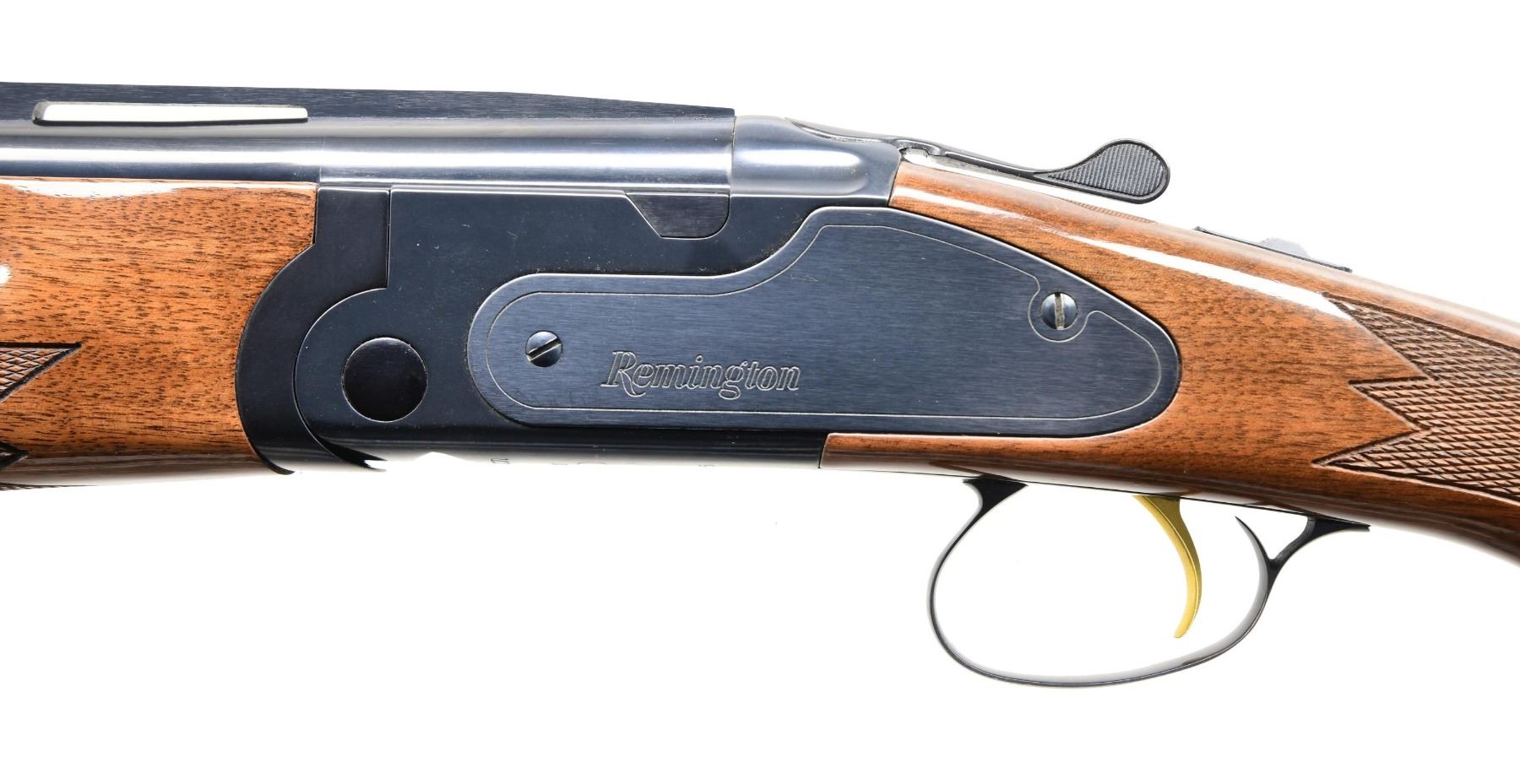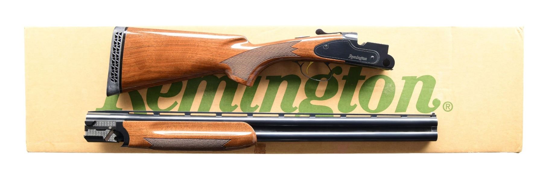 FACTORY BOX. Cal. 12 GA, 2 3/4" or 3". S# RP010855. Bbl. 25 3/8". Peerless Field O/U shotgun mfg. by Remington Arms Company. Let side of bbls. is marked with Remington's mfg. information, with the cal. designation marked on the right. Receiver sideplates are marked with the Remington trademark logo, with the model designation and the S# marked on the underside. Metal components exhibit a blue finish overall. Checkered wood pistol grip buttstock and forend. Matte V/R with white plastic bead front sight. Bbls. feature threaded chokes, with the top bbl. retaining a Full choke and the bottom a Modified choke. UNATTACHED ACCESSORIES: unnumbered factory box containing an Improved Cyl. choke and a choke tool. CONDITION: excellent, with metal components retaining bountiful amounts of their original factory blue finish overall. Mirror bores. Wood furniture is excellent, showing a few light superficial handling marks. Box shows some light exterior wear from handling and storage but otherwise remains sturdy and serviceable. (24-3048/MLW). MODERN. $600-900.