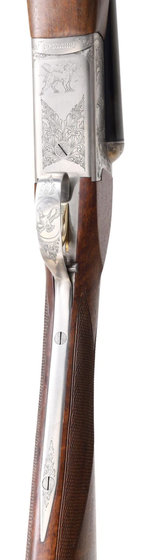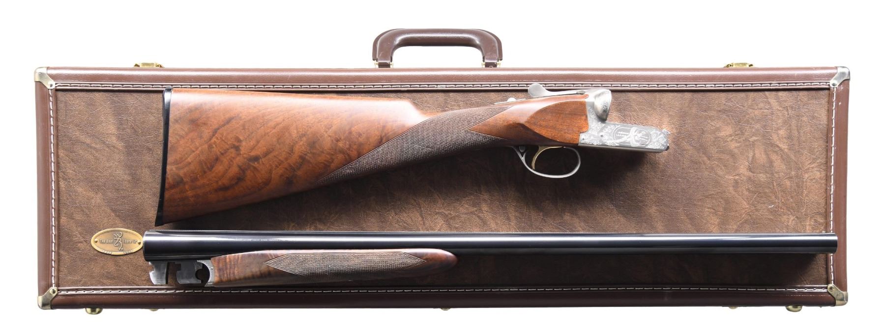 Cal. 12 Ga, 3". S# 05024PY158 (1982). Bbls. 26" with brass bead; Mod. & Imp. Mod. chokes. Satin grey finished receiver with scroll engraving along with engraved quail, pheasant, duck & setters. Gold anodized single trigger & extractors. Satin finished checkered walnut stock set with semi beavertail forearm & straight grip buttstock. LOP: 14.5" to Browning buttplate. UNATTACHED ACCESSORIES: Browning case containing packaging to include keys. CONDITION: all aspects near excellent with light fouling in bores. (24-3971/MD). MODERN. $1,500-2,500.