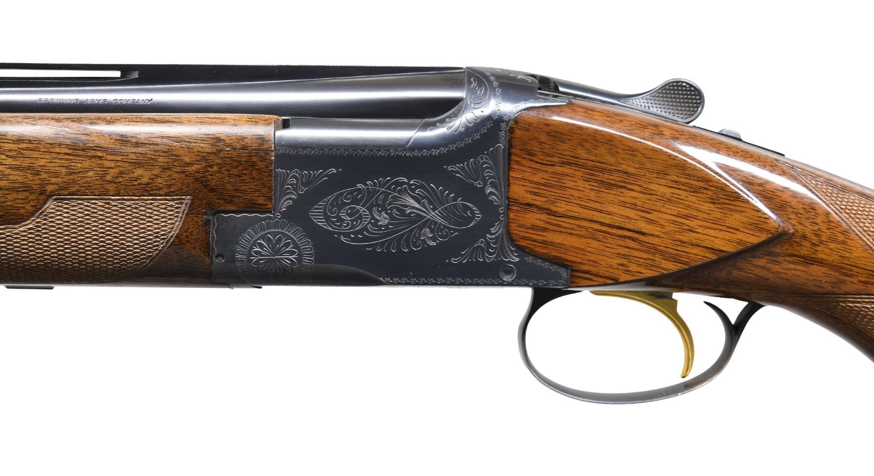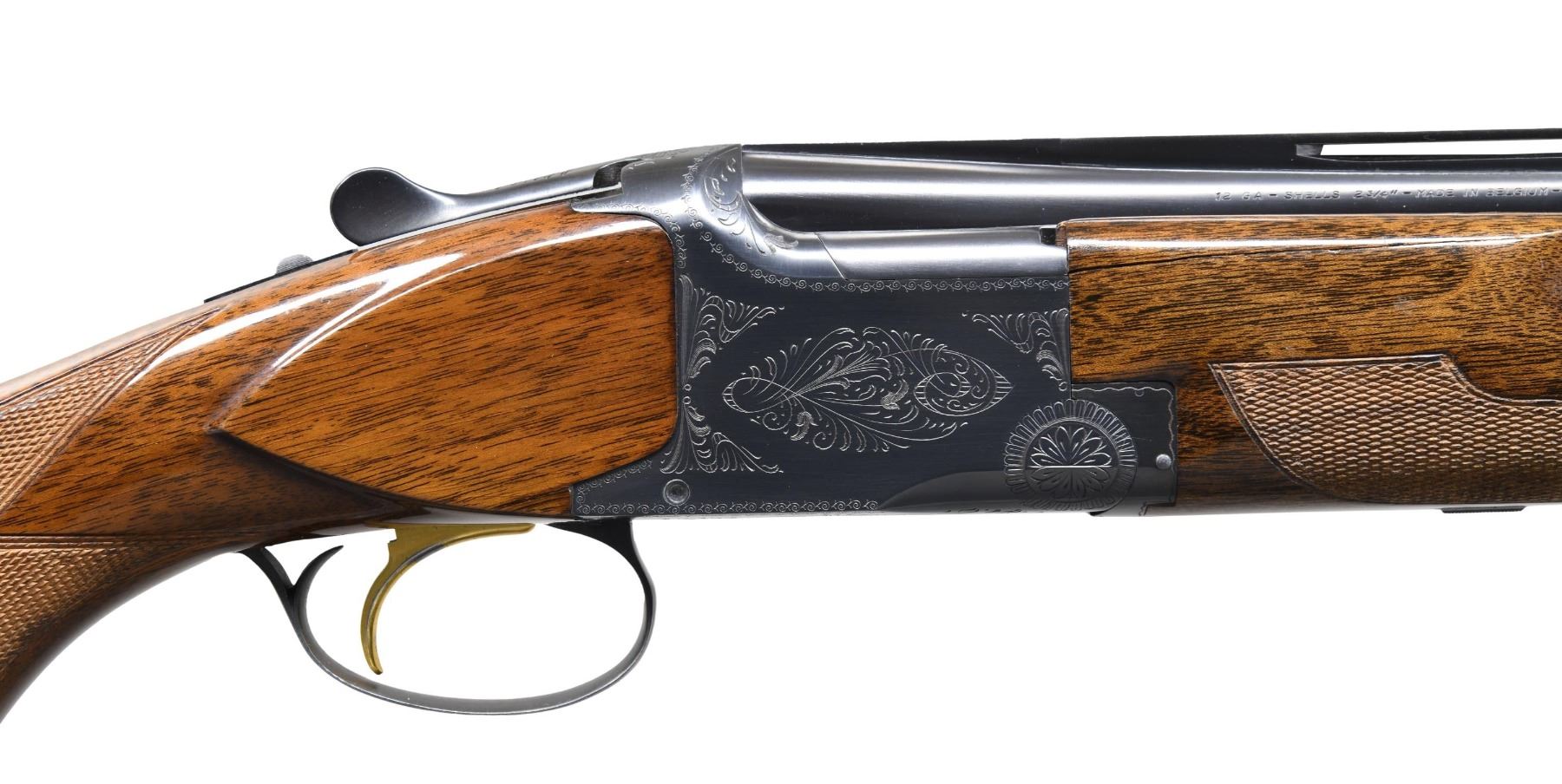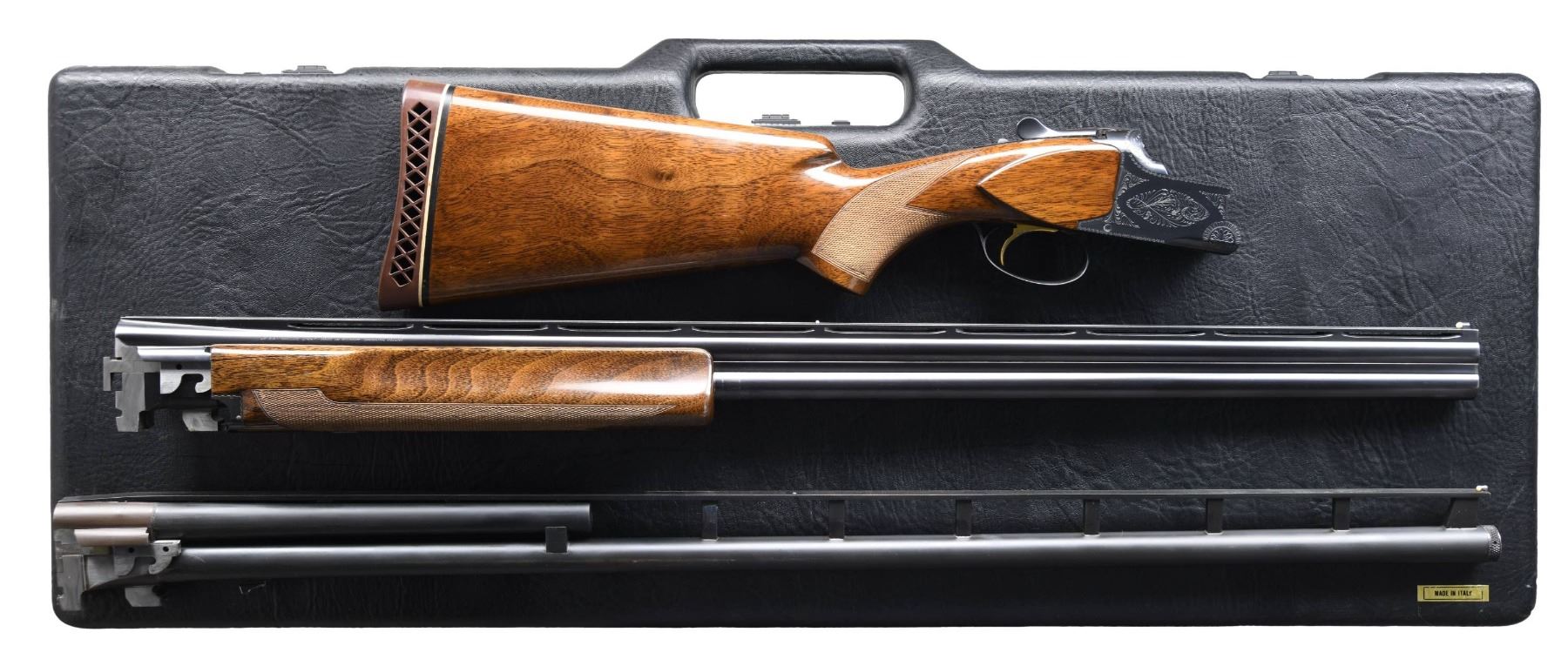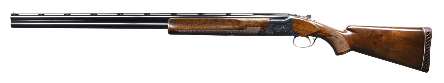 BARREL SET. Cal. 12 Ga., 2 3/4". S# 31107S70 (1970). Barrel (1): Matching numbered Broadway VR 32" barrel with white front sight & mid bead; threaded to allow screw in choke tubes. Barrel (2): 33 7/8" Single Trap barrel with tall rib, white front bead & missing mid bead; threaded for Winchokes. Blued finished with Grade 1 engraving on receiver. Gold anodized SST & ejectors. Gloss finished checkered walnut stock set. LOP: 14.5" over Browning ventilated pad. UNATTACHED ACCESSORIES: Hard case containing Winchokes, choke wrench, Briley choke tubes & IC & Full choke tubes, CONDITION: near excellent blue. Forearm has large cracks on both sides. Very good wood finish with light wear and handling marks. Bores are shiny showing some fouling. Barrel 2 has very good matte finish with light fouling in bore. (24-4020/MD). CURIO. $1,000-1,500.