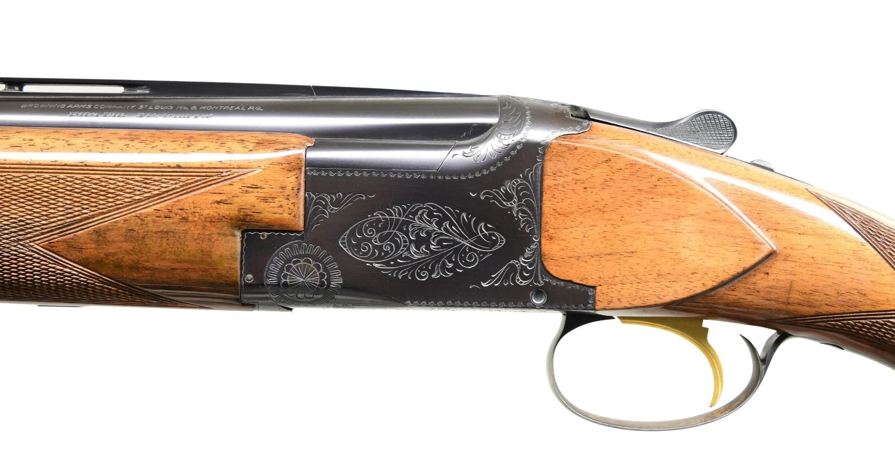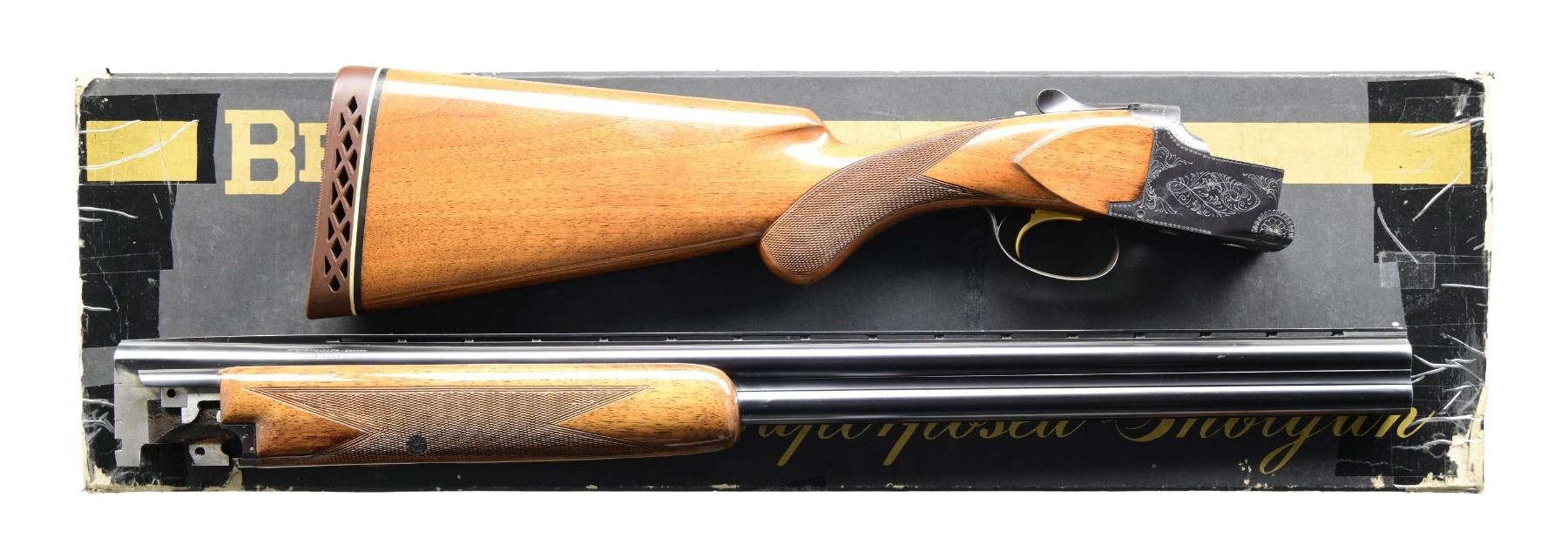 SHOTGUN. Cal. 12 Ga., 2 3/4". S# B98337. Bbls. 26 1/2". Mfg. 1962, before the change to the "2S" prefix (S# range 96501-99999). The VR barrels have bright bead. Fixed Skeet chokes. Action has Grade 1 engraving with SST, ejectors, and top tang selector. Field forearm with long tang pistol grip walnut stock. LOP: 14 1/2" to ventilated Softee White Line pad. UNATTACHED ACCESSORIES: Browning Superposed box with hang tag and a later model manual; in fair condition with considerable tape repairs. CONDITION: very good to near excellent blue, showing wear to bottom tang and minimal handling marks. Very good wood finish with light scratches. Very good, shiny bores. (24-3033/MD). CURIO. $800-1,200.