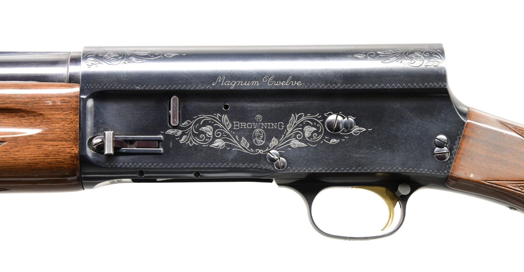Cal. 12 Ga., 3". S# 03432PY151 (1982). Bbl. 30". The VR barrel has bright front bead. Fixed IM choke. Gloss-finished action with gold-finished trigger. Checkered, gloss-finished walnut stock set with Browning ventilated pad. CONDITION: very good blue, scattered light finish loss, and scattered patina on receiver. Good wood finish, showing scattered marks and mildew on wrist. Very good, shiny bore. (24-3444/MD). MODERN. $700-1,000.