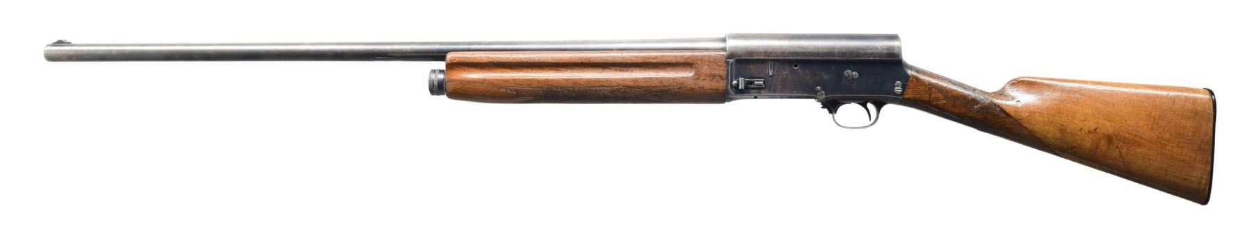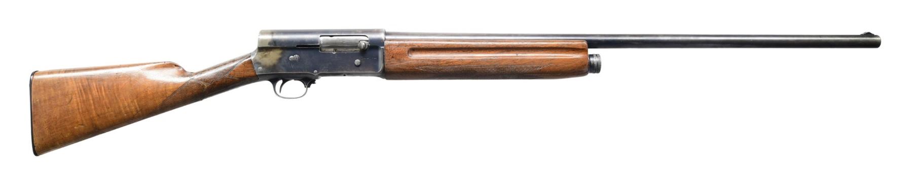 SHOTGUN. Cal. 12 GA, 2 3/4". S# 43523. Bbl. 29 1/2". Model A5 semi-automatic shotgun mfg. in Belgium by Fabrique Nationale and imported by Browning Arms Company. Top of the bbl. is marked with Browning's importer information, with the cal. designation marked on the left. Left side of the receiver is marked with Fabrique Nationale's mfg. information above, "BROWNING'S PATENT DEPOSE". Metal components exhibit a blue finish overall, save for the bolt assembly and loading gate, which are polished in-the-white. Checkered wood straight grip buttstock and forend. Buttstock exhibits a repair around the circumference of the wrist and has been sanded and revarnished at one time. Top right side of the receiver exhibits a large crack towards the rear edge, with a section appearing to have been welded at one time. Right side of receiver exhibits an additional crack at the bottom rear edge of the charging handle channel. Bead front sight is absent. CONDITION: metal components retain fair to good amounts of their original factory blue finish, exhibiting wear, thinning, scattered handling marks, as well as light surface oxidation overall. Rear and right side of the receiver exhibit heat-related discoloration. Very bright bore, exhibiting a few dings throughout. Action functions appropriately when cycled by hand. Wood furniture exhibits scattered marks and impressions from handling and storage, with the forend exhibiting a large repaired crack on the left-hand side, as well as cracking on the interior on the "shelf". (24-3418/MLW). CURIO. $200-300.