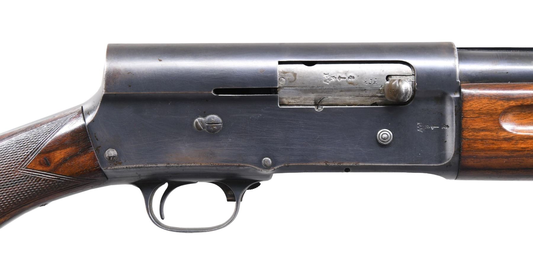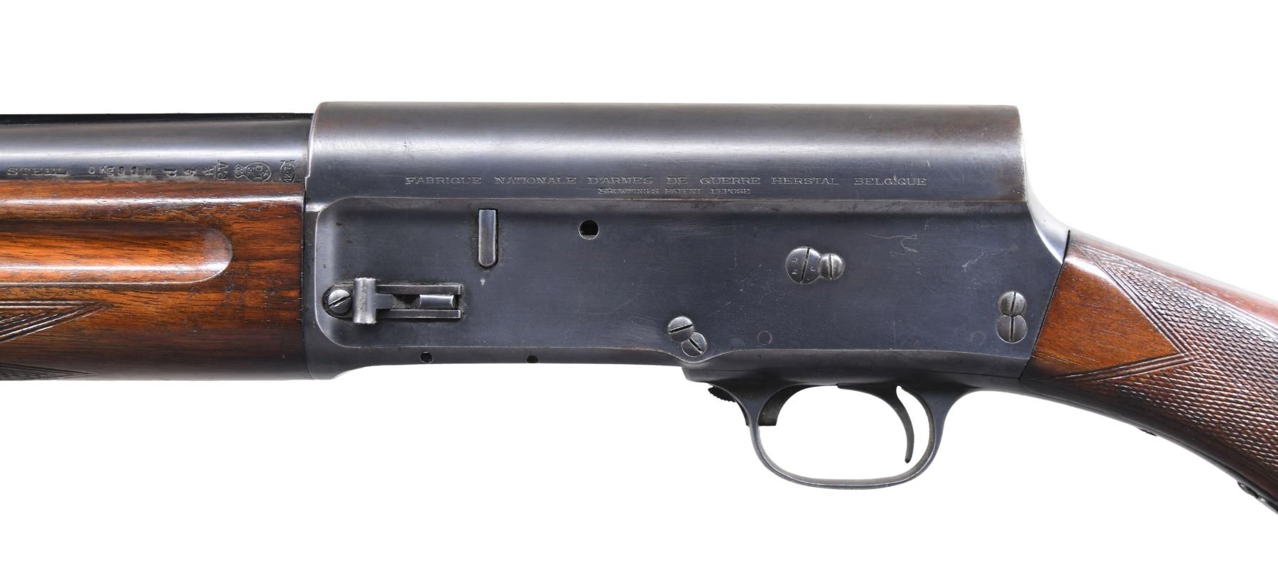 SHOTGUN. Cal. 12 GA. S# 79393. Bbl. 27 5/8". Model A5 semi-automatic shotgun mfg. by Fabrique Nationale prior to WWII. The left side of the bbl. is marked "FULL 12 SPECIAL STEEL", followed by Belgian proofs, with "MADE IN BELGIUM" marked on the right. Left side of receiver is marked "FABRIQUE NATIONALE D'ARMES DE GUERRE HERSTAL BELGIQUE/ BROWNINGS PATENT DEPOSE". Metal components exhibit a blued finish. Checkered wood round knob buttstock with "AUTOMATIC", "FN", "BROWNING" horn buttplate, and checkered wood forend with grasping grooves. Bbl. has been fitted with a V/R Poly-Choke. Matching numbers are present on the receiver, bolt, bolt charging handle, as well as on the bbl. Stock and forend match via number "170075". CONDITION: metal components retain large amounts of their original factory blue finish, exhibiting areas of wear and thinning that show through to brown patina, with some scattered areas of light to mild pitting overall. Mirror bore. Wood furniture shows some scattered marks and minor impressions from handling and storage, with the forend exhibiting a small crack on the right side stemming from the breech, and the buttstock a small crack stemming from the rear of the upper receiver tang. (23-7065/MLW). CURIO. $300-450.