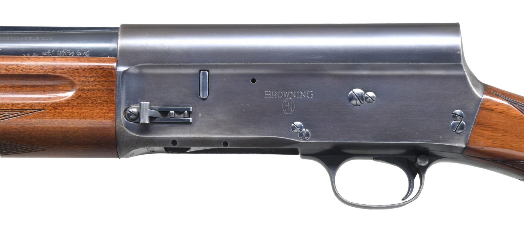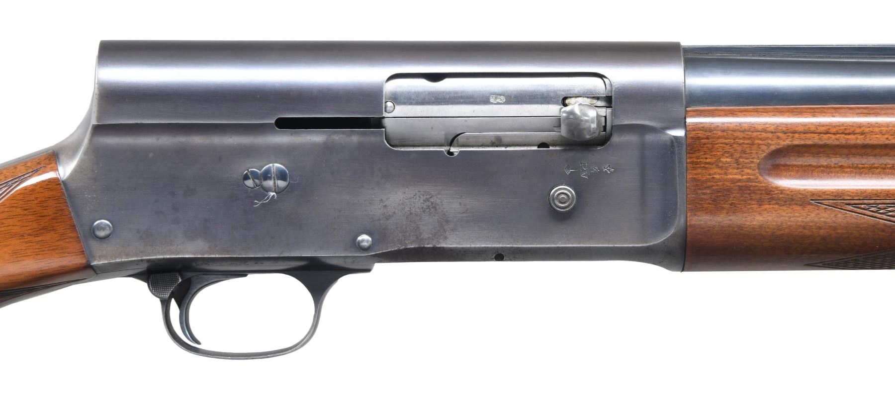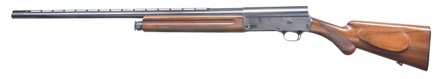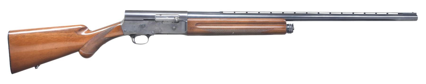SHOTGUN. Cal. 12 GA, 2 3/4". S# 6363568. Bbl. 27 5/8". Model A5 semi-automatic shotgun, mfg. in Belgium by Fabrique Nationale. Left side of the bbl. is marked with FN's mfg. information above, "* ACIER SPECIAL-C.12-CART. 2 3/4", followed by Belgian proofs. Left side of receiver is marked "BROWNING" above an "FN" monogram, with Belgian proofs stamped on the right. Metal components exhibit a blue finish overall. Checkered rnd. knob buttstock with cheek rest, and checkered wood forend. Matte V/R with aluminum bead front sight. CONDITION: metal components retain most of their original factory blue finish, exhibiting wear, thinning, scattered handling marks, as well as some areas of oxidation/pitting present primarily on the receiver. Mirror bore. Wood furniture shows some scattered handling marks and some small impressions from handling and storage, but otherwise remains sturdy and serviceable. (24-3899/MLW). MODERN. $350-550.
