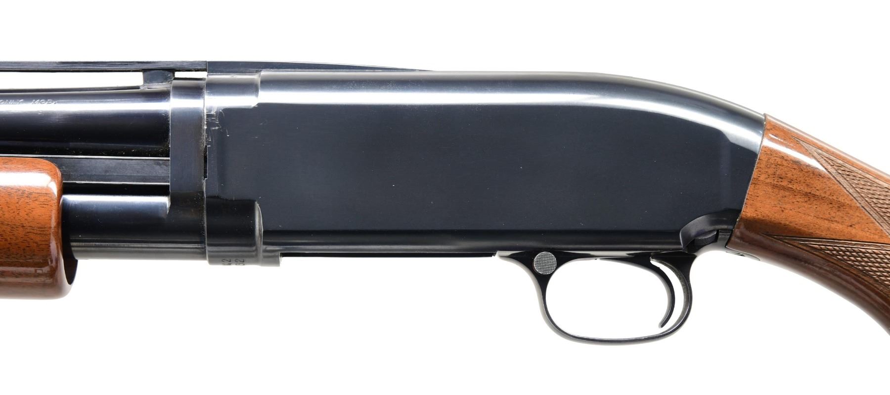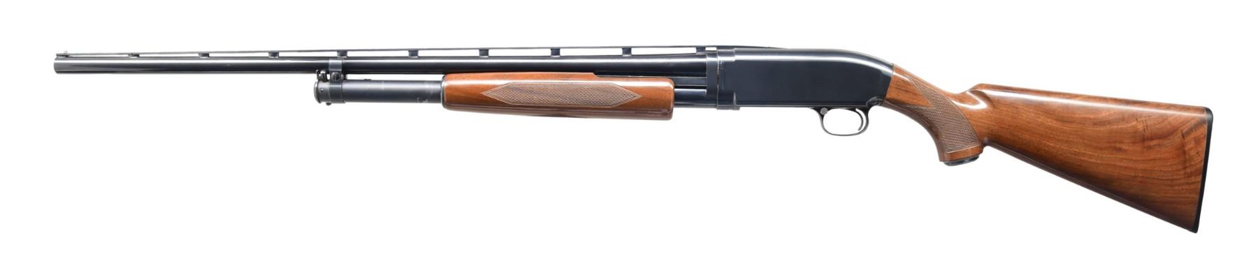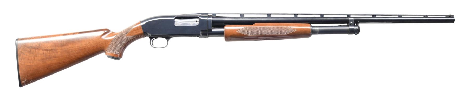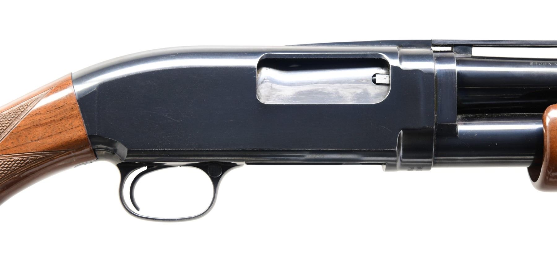 Cal. 20 GA, 2 3/4". S# 06142PN832. Bbl. 26 1/8". Model 20 pump action shotgun mfg. in Japan and imported/retailed by Browning Arms Company. Left side of the bbl. is marked with the model and cal. designations, followed by "MOD." with Browning's importer information above "MADE IN JAPAN" marked on the right. Metal components exhibit a blue finish overall, save for the bolt, which is polished in-the-white. Checkered wood pistol grip buttstock and pump. Grooved matte V/R with aluminum bead front sight. CONDITION: metal components retain bountiful amounts of their original factory blue finish, exhibiting a few handling marks on the left side of the receiver as well as a couple minute spots of finish loss on the left side of the bbl. Brilliant mirror bore. Action functions appropriately when cycled by hand. Wood furniture exhibits some scattered marks and minor impressions, with some notable marks present on the right side of the buttstock at the toe. (24-2850/MLW). MODERN. $400-600.
