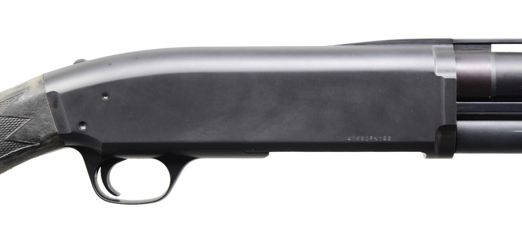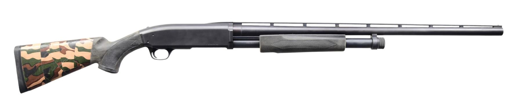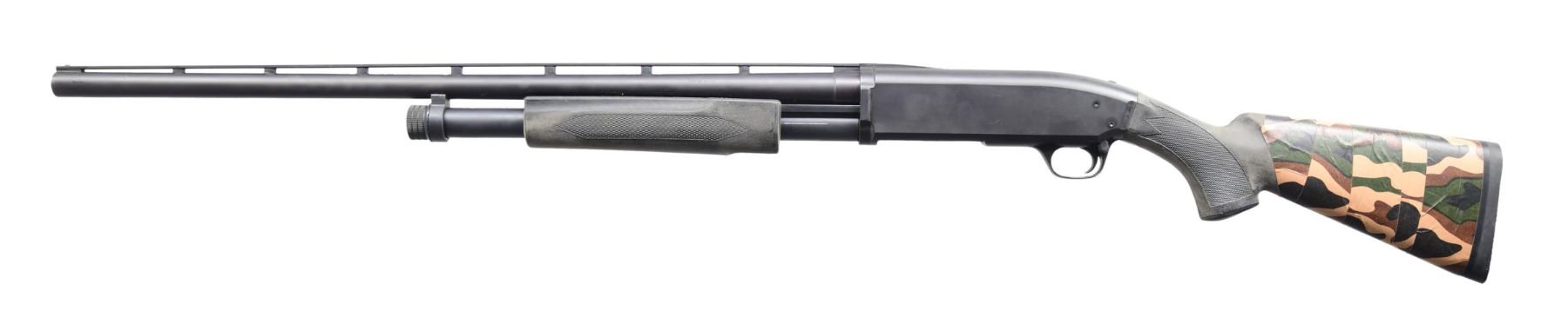 SHOTGUN. Cal. 12 GA, 2 3.4", 3", and 3 1/2". S# 41690PN152. Bbl. 28 1/4". BPS Field Model pump action shotgun mfg. in Japan and imported/retailed by Browning Arms Company. Left side of bbl. is marked with Browning's importer information over "MADE IN JAPAN", with the model and cal. designations marked on the right. Metal components exhibit a matte blue finish overall, save for the aluminum trigger guard, which exhibits a black enamel finish. Checkered black polymer buttstock with camouflage tape wrapping and checkered black polymer pump. Matte V/R with aluminum bead front sight. Bbl. is fitted with a threaded Full choke. CONDITION: very good to excellent, with metal components retaining the vast majority of their original factory finishes overall, exhibiting some wear on the mag. tube from cycling of the action, as well as some scattered superficial marks from handling and storage. Mirror bore. Action functions appropriately when cycled by hand. Polymer furniture is very good overall. (24-3433/MLW). MODERN. $300-500.