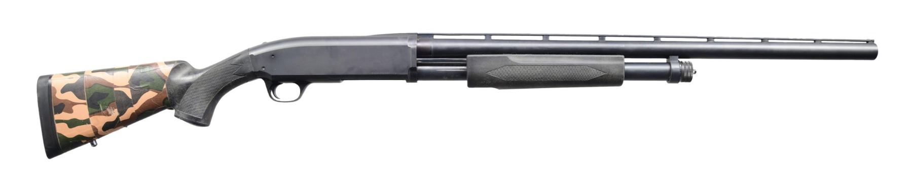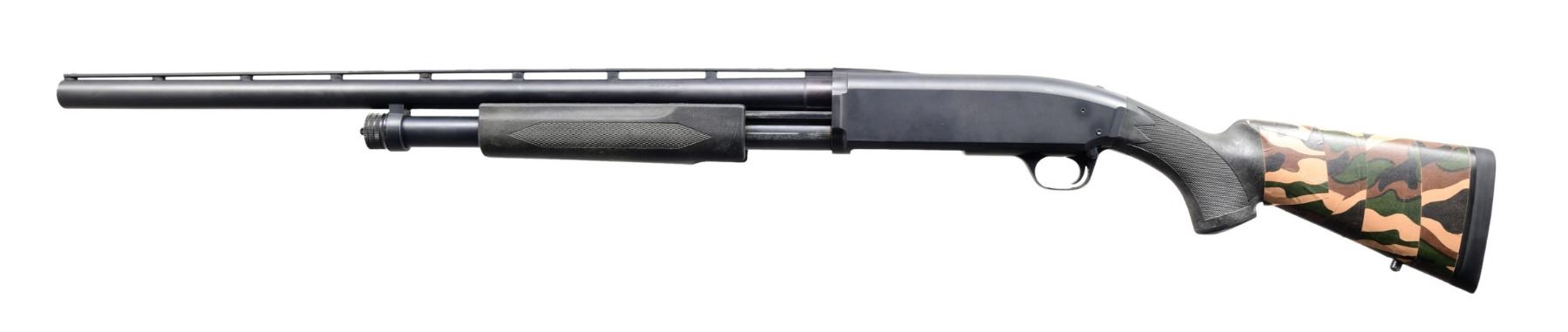 SHOTGUN. Cal. 10 GA, 3 1/2". S# 04554PN192. Bbl. 26 1/4". BPS Field Model pump action shotgun mfg. in Japan and imported/retailed by Browning Arms Company. Left side of bbl. is marked with Browning's importer information above "MADE IN JAPAN", with the model and cal. designations marked on the right. Metal components exhibit a matte blue finish overall, save for the aluminum trigger guard, which exhibits a black enamel finish. Checkered black polymer pistol grip butt with camouflage tape wrap and checkered polymer pump. Matte V/R with aluminum bead front sight. Bbl. is fitted with a threaded Improved Cyl. choke. CONDITION: very good to excellent, with metal components retaining bountiful amounts of their original factory finishes overall, exhibiting some wear on the mag. tube from cycling of the action, as well as some scattered superficial handling marks overall. Mirror bore, exhibiting a couple of small spots of what appears to be light surface oxidation throughout. Action functions appropriately when cycled by hand. Polymer furniture is very good overall. (24-3511/MLW). MODERN. $300-400.